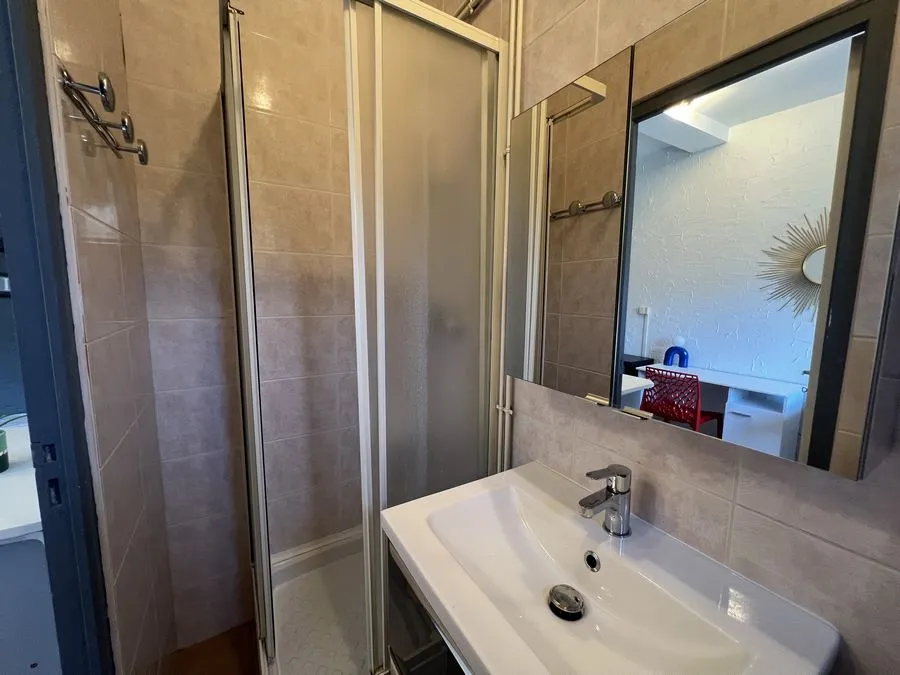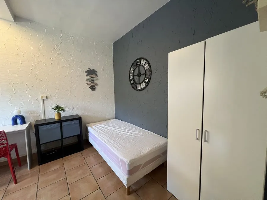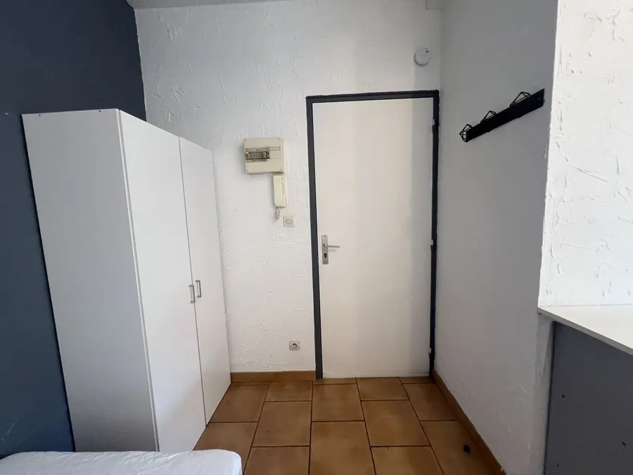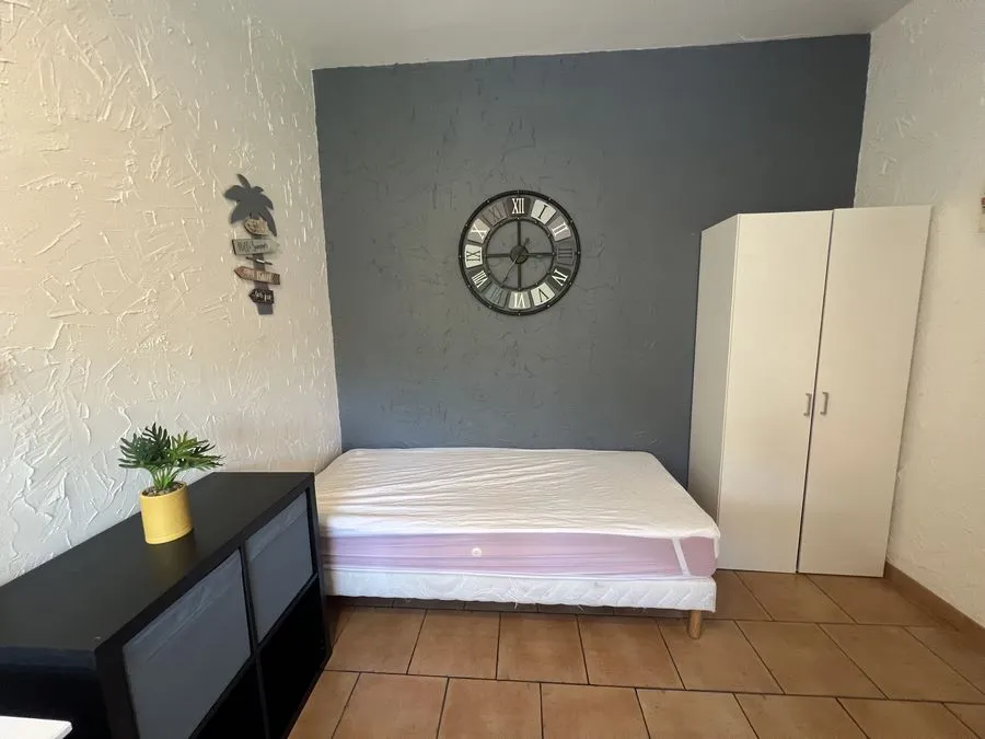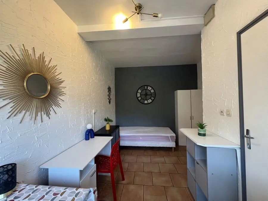 Il se compose d'une pièce à vivre carrelée avec une grande fenêtre en double vitrage avec volet. Les murs sont en fibre de verre peints en blanc et gris. Vous trouverez une cuisine équipée carrelée avec un évier, 2 plaques électriques, un frigidaire, une hotte et des meubles de cuisine hauts et bas. La salle de douche est carrelée avec une vasque, elle possède une douche, un lavabo et un toilette. L'appartement meublé avec goà»t est composé d'un bureau, table et chaises, un lit simple, 2 meubles de rangement, une penderie.