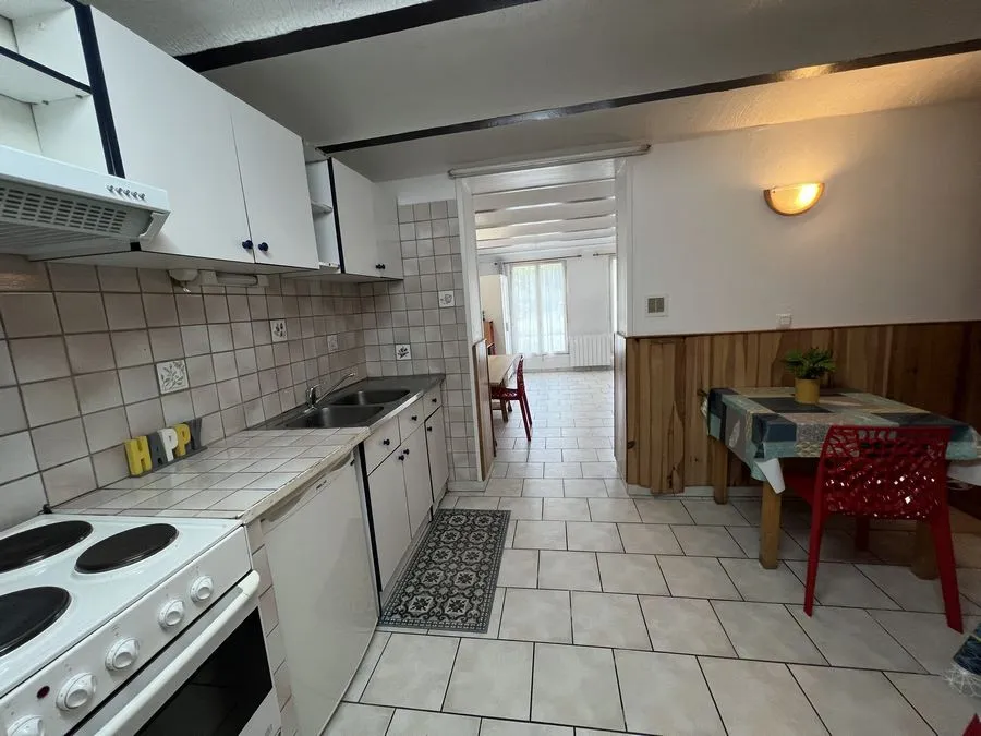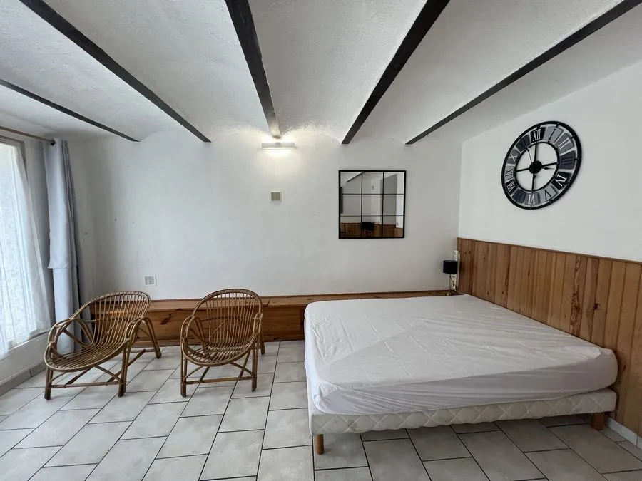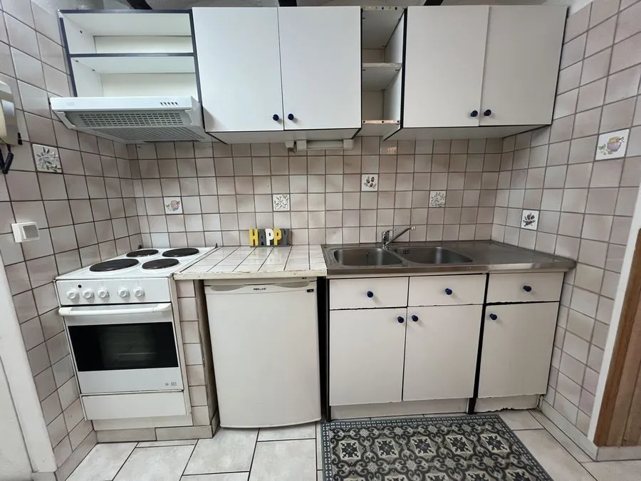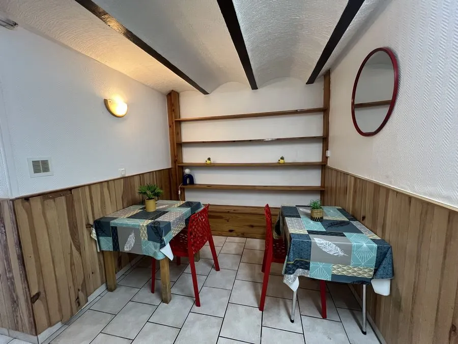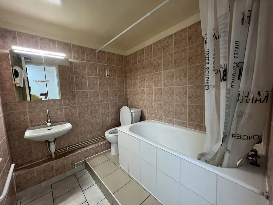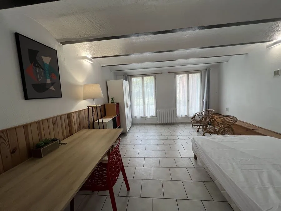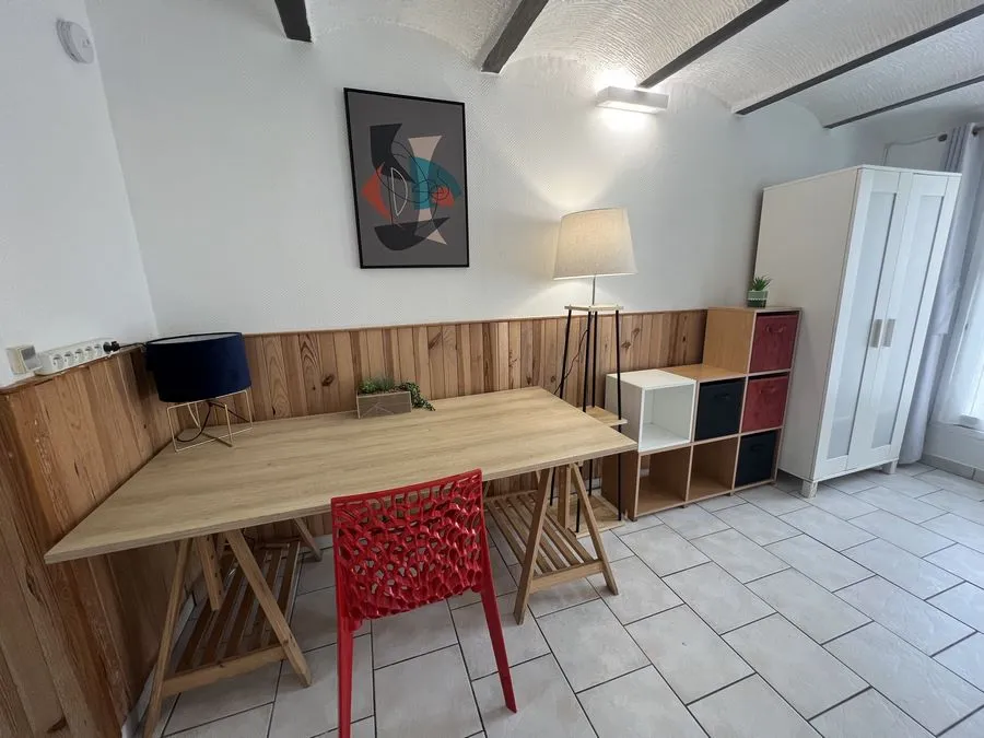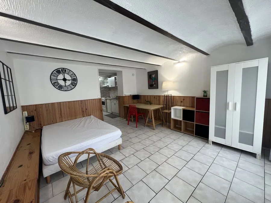 Il se compose d'une pièce à vivre carrelée avec 2 fenêtres en double vitrage avec rideaux donnant sur la cour commune. Les murs sont en fibre de verre peints en blanc. Vous trouverez une cuisine équipée carrelée avec un évier, 2 plaques électriques, un frigidaire, une hotte et des meubles de cuisine hauts et bas. La salle de bain est carrelée avec une vasque, elle possède une baignoire, un lavabo et un toilette. L'appartement meublé avec goà»t est composé de 2 tables, de chaises, une chaise de bureau, un lit double, une penderie, un bureau, 2 chaises en rotin, une table de nuit bois et noire, un meuble de rangement, un luminaire, une lampe de nuit.
