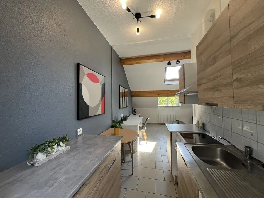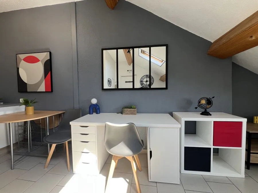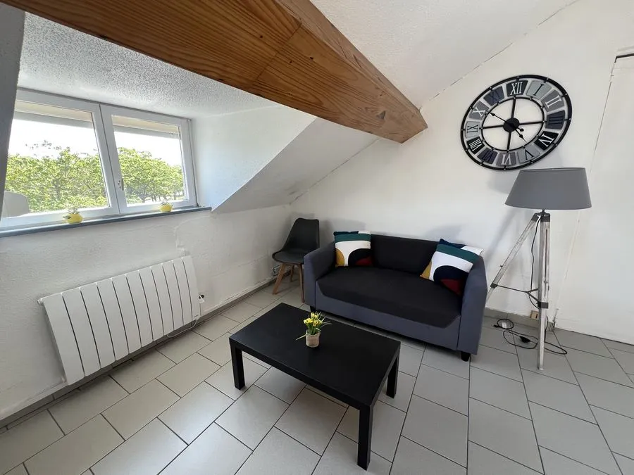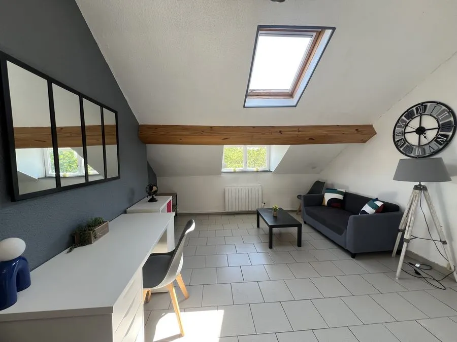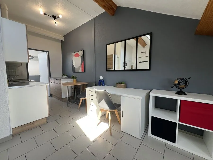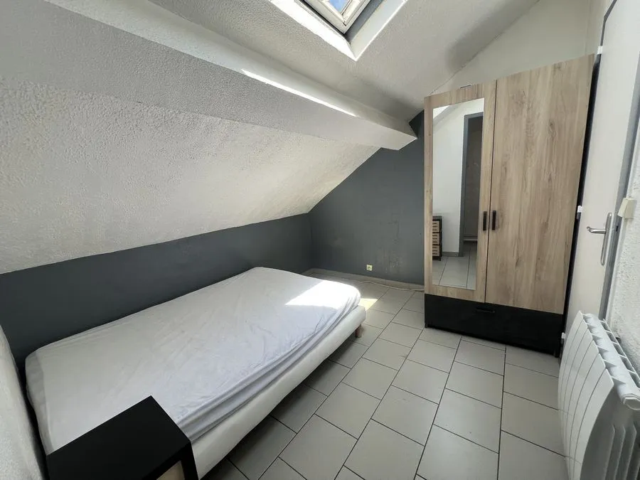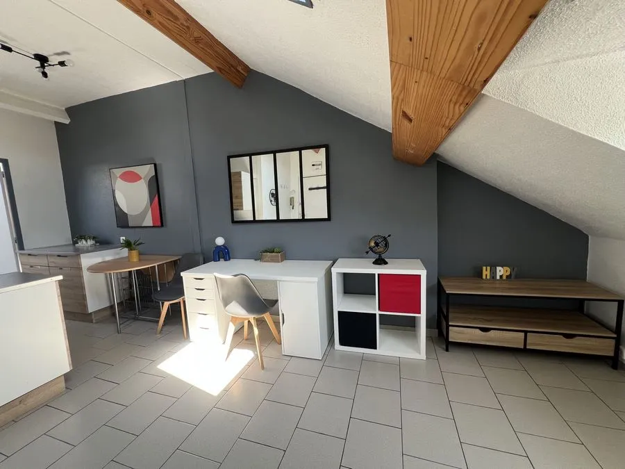 Il se compose d'une pièce à vivre carrelée avec un velux et une fenêtre en double vitrage avec volet. La chambre possède également un velux. Les murs sont en fibre de verre peints en blanc et gris. Vous trouverez une cuisine équipée carrelée avec un évier, 2 plaques électriques, un frigidaire, un four, une hotte et des meubles de cuisine hauts et bas. La salle de douche est carrelée avec une vasque, elle possède une douche, un lavabo et un toilette. L'appartement meublé avec goà»t est composé d'une table, de chaises, un lit simple, une table de nuit bois et noire, un luminaire, une table basse, 2 meubles TV, un canapé gris 2 places, une penderie.
