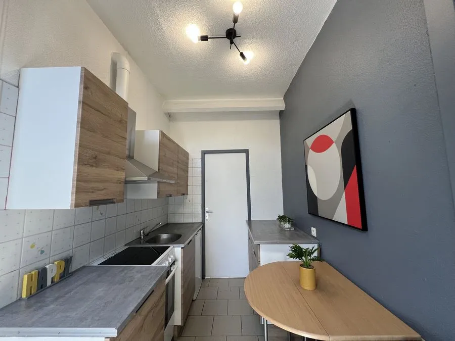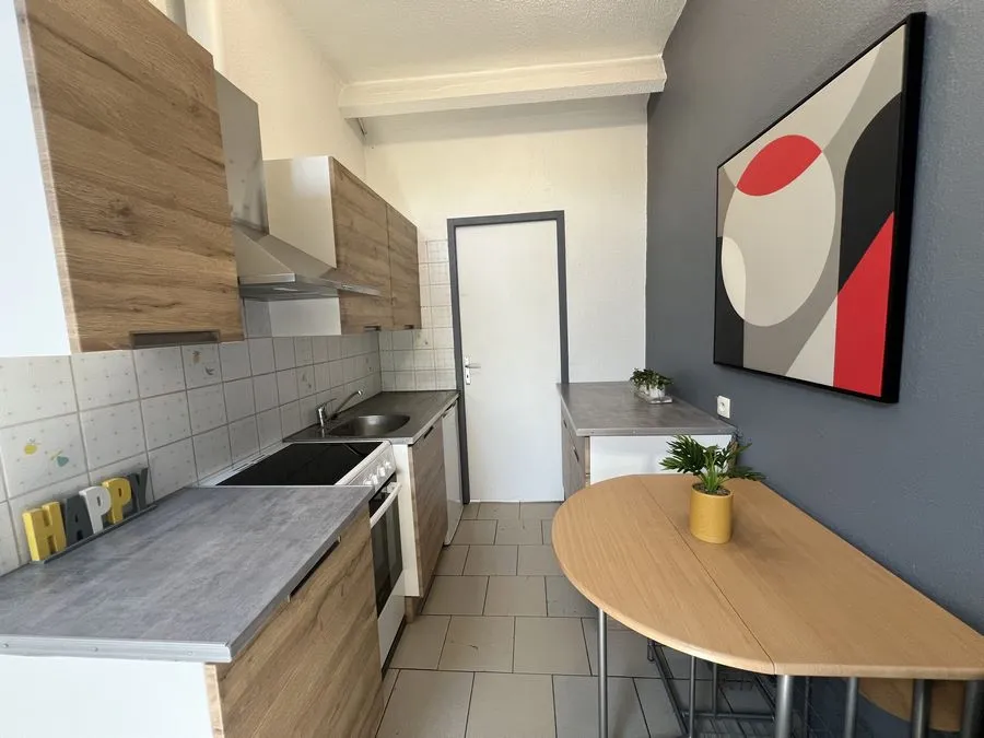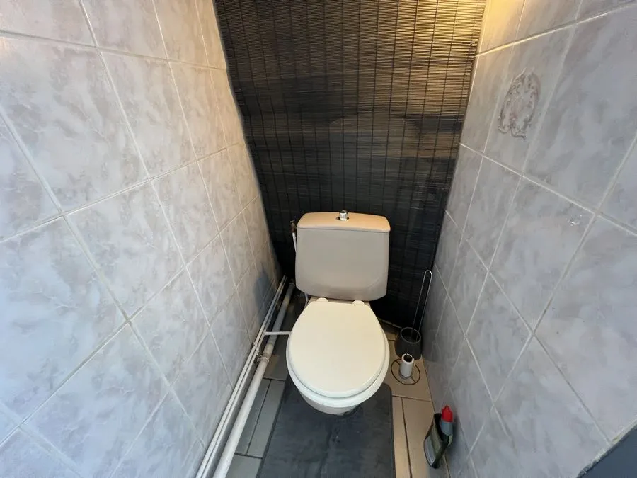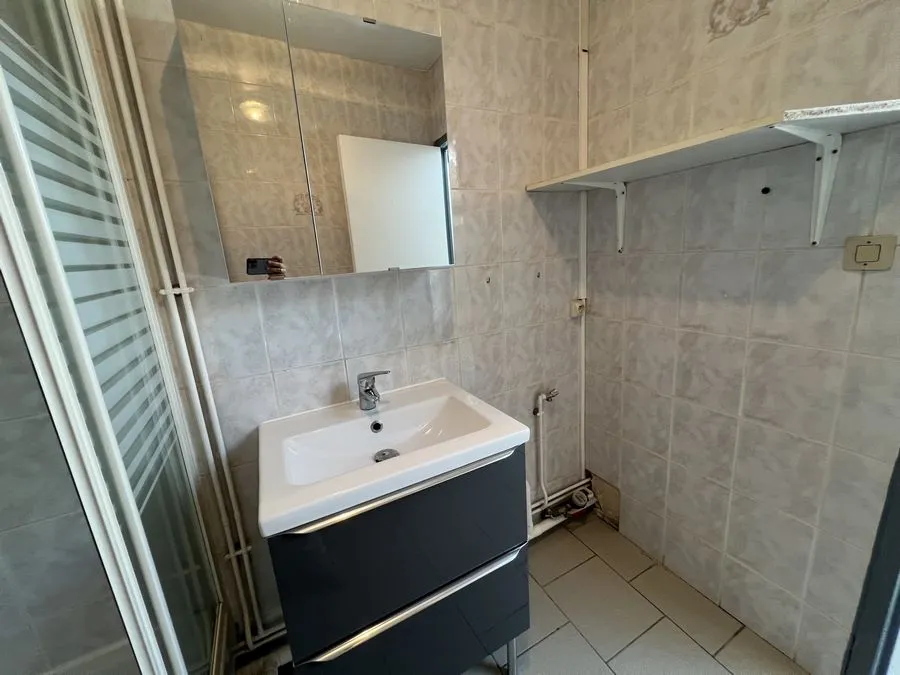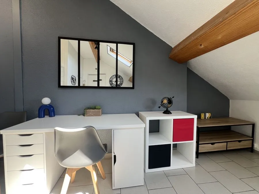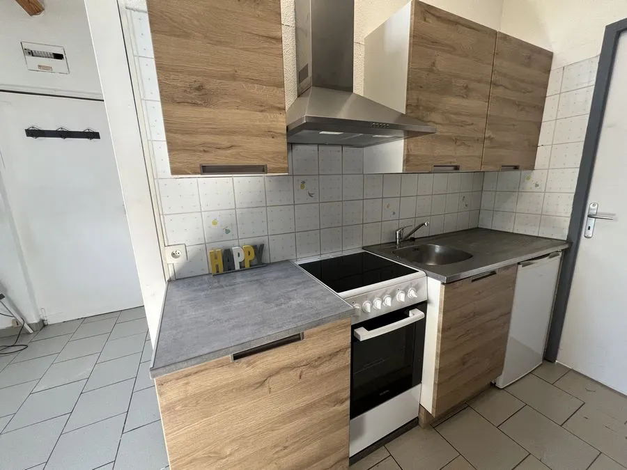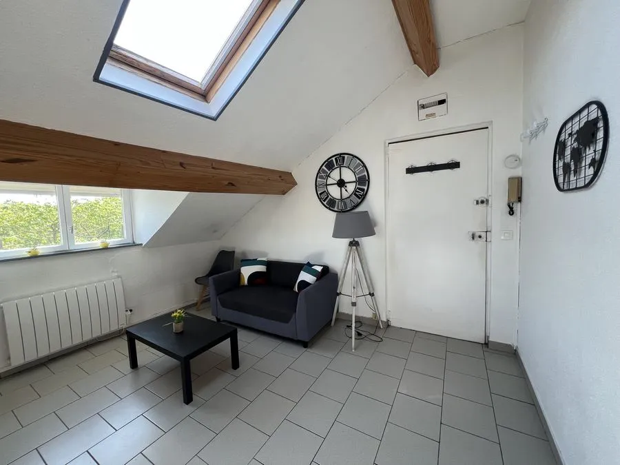 Il se compose d'une pièce à vivre carrelée avec un velux et une fenêtre en double vitrage avec volet. La chambre possède également un velux. Les murs sont en fibre de verre peints en blanc et gris. Vous trouverez une cuisine équipée carrelée avec un évier, 2 plaques électriques, un frigidaire, un four, une hotte et des meubles de cuisine hauts et bas. La salle de douche est carrelée avec une vasque, elle possède une douche, un lavabo et un toilette. L'appartement meublé avec goà»t est composé d'une table, de chaises, un lit simple, une table de nuit bois et noire, un luminaire, une table basse, 2 meubles TV, un canapé gris 2 places, une penderie.