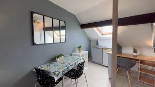 Il se compose d'une pièce à vivre carrelée avec un velux et une fenêtre en double vitrage avec stores. La salle d'eau possède possède également un velux. Les murs sont en fibre de verre peints en blanc et gris. Vous trouverez une cuisine équipée carrelée avec un évier, 2 plaques électriques, un frigidaire, une hotte et des meubles de cuisine hauts et bas. La salle d'eau est carrelée avec une vasque, elle possède une douche, un lavabo et un toilette. L'appartement meublé avec goà»t est composé d'une table, de chaises, un lit double, un meuble de rangement, un bureau, un luminaire, une penderie.