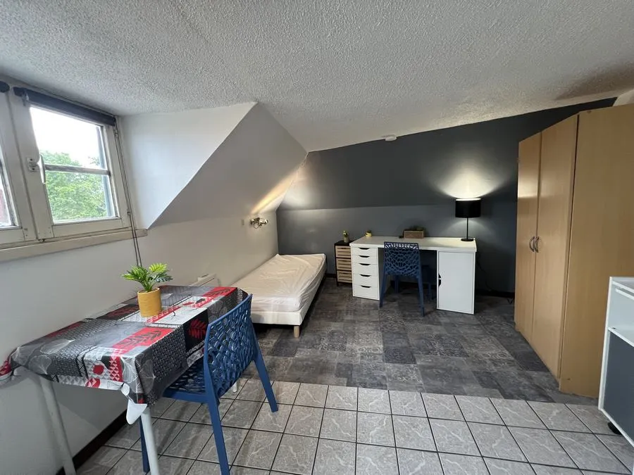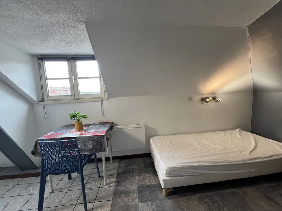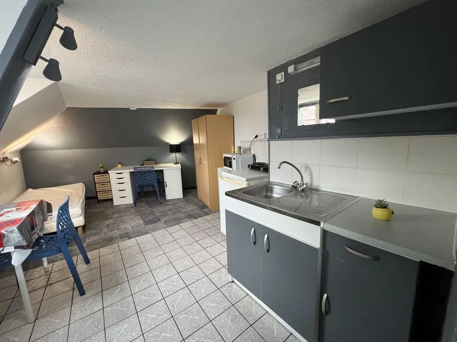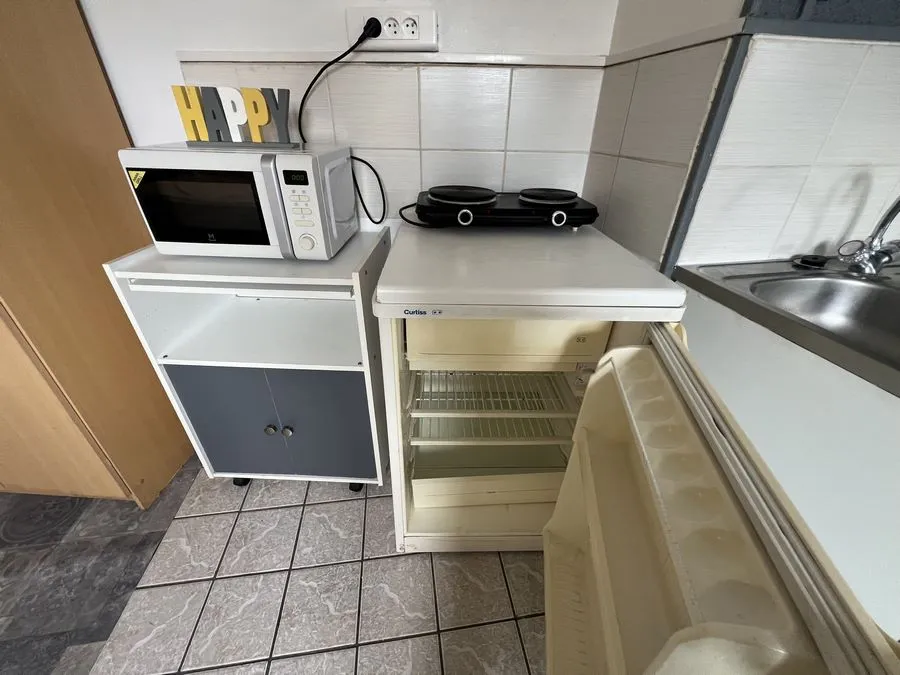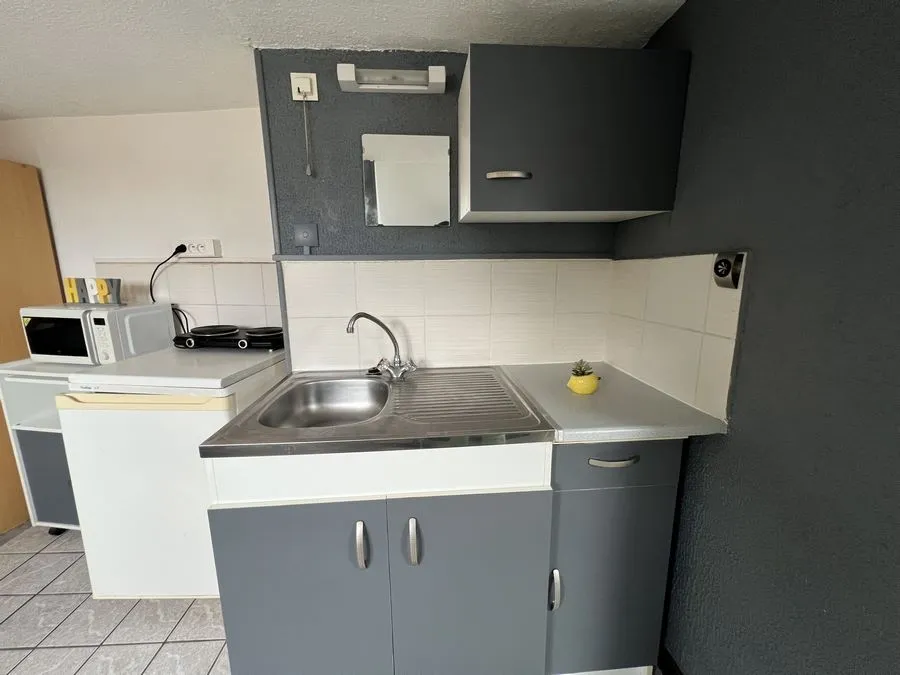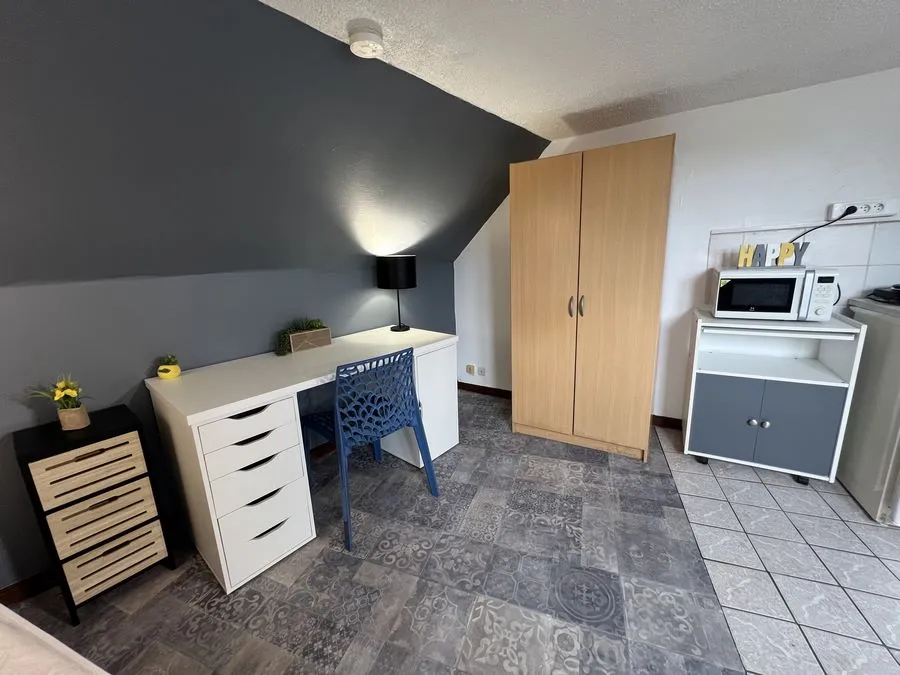 Il se compose d'une pièce à vivre entièrement carrelée, les murs sont en fibre de verre peints en blanc et gris. Ce studio est muni de 2 fenêtres en bois avec store. Vous trouverez une kitchenette équipée carrelée avec un évier, 2 plaques électriques, un frigidaire, une hotte et des meubles de cuisine hauts et bas. L'appartement meublé avec goà»t est composé d'une douche, un lit simple, un bureau, une penderie, kitchenette équipée, une table de nuit bois et noire, une lampe de bureau, un meuble de rangement.