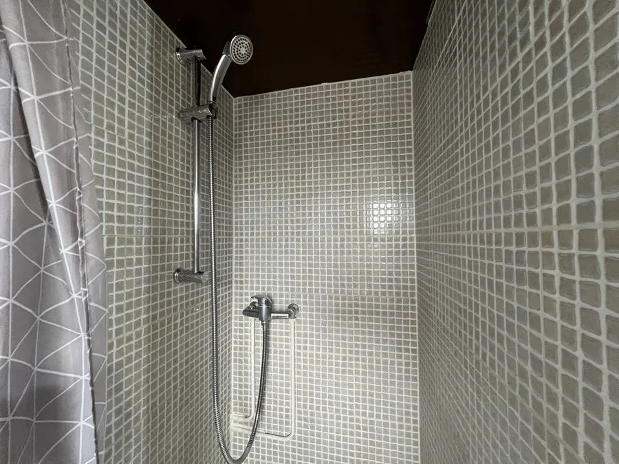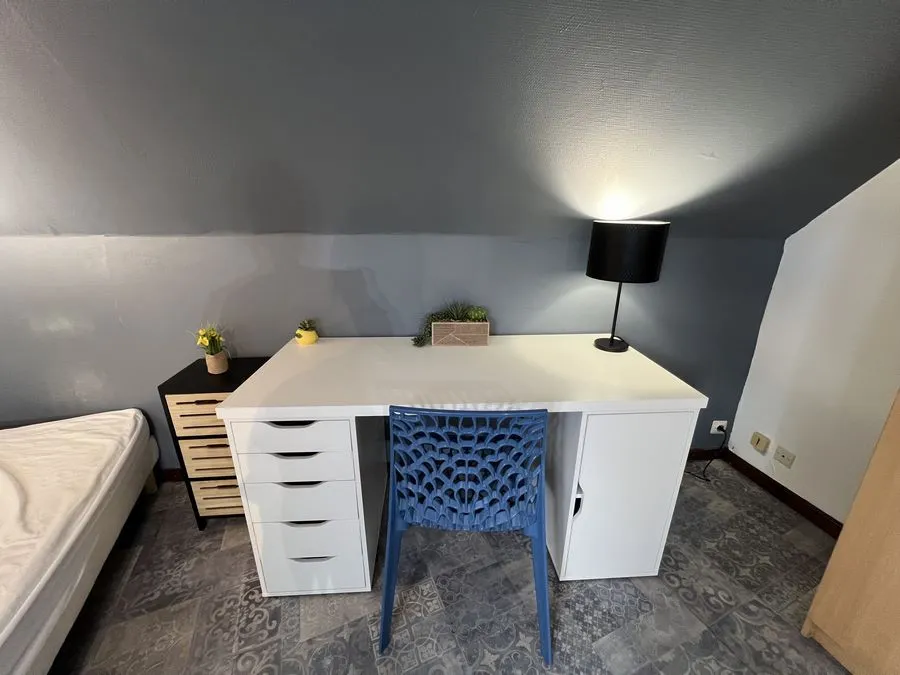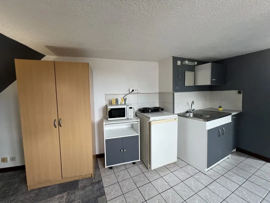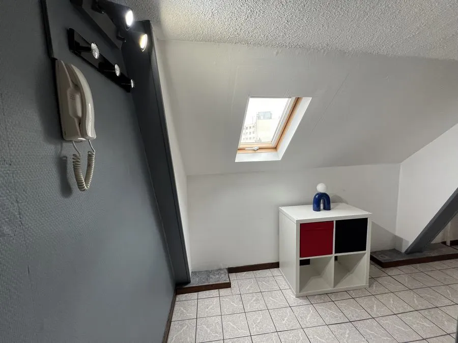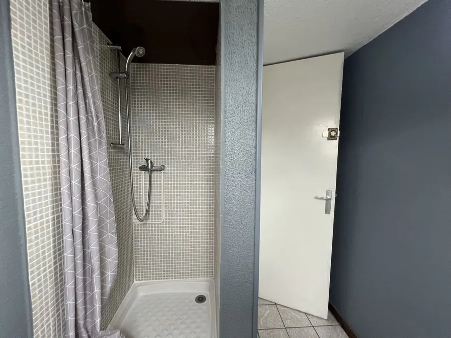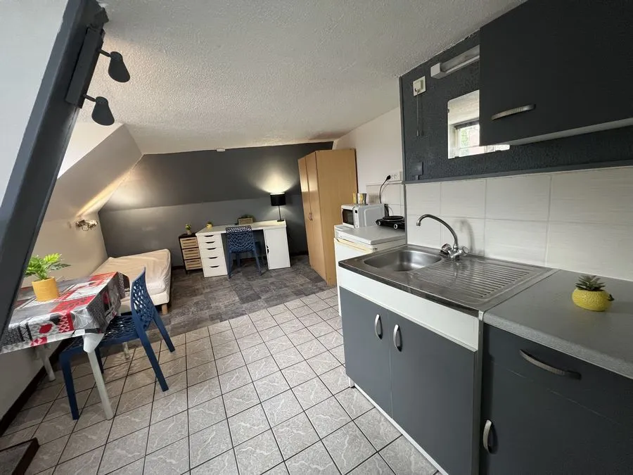 Il se compose d'une pièce à vivre entièrement carrelée, les murs sont en fibre de verre peints en blanc et gris. Ce studio est muni de 2 fenêtres en bois avec store. Vous trouverez une kitchenette équipée carrelée avec un évier, 2 plaques électriques, un frigidaire, une hotte et des meubles de cuisine hauts et bas. L'appartement meublé avec goà»t est composé d'une douche, un lit simple, un bureau, une penderie, kitchenette équipée, une table de nuit bois et noire, une lampe de bureau, un meuble de rangement.