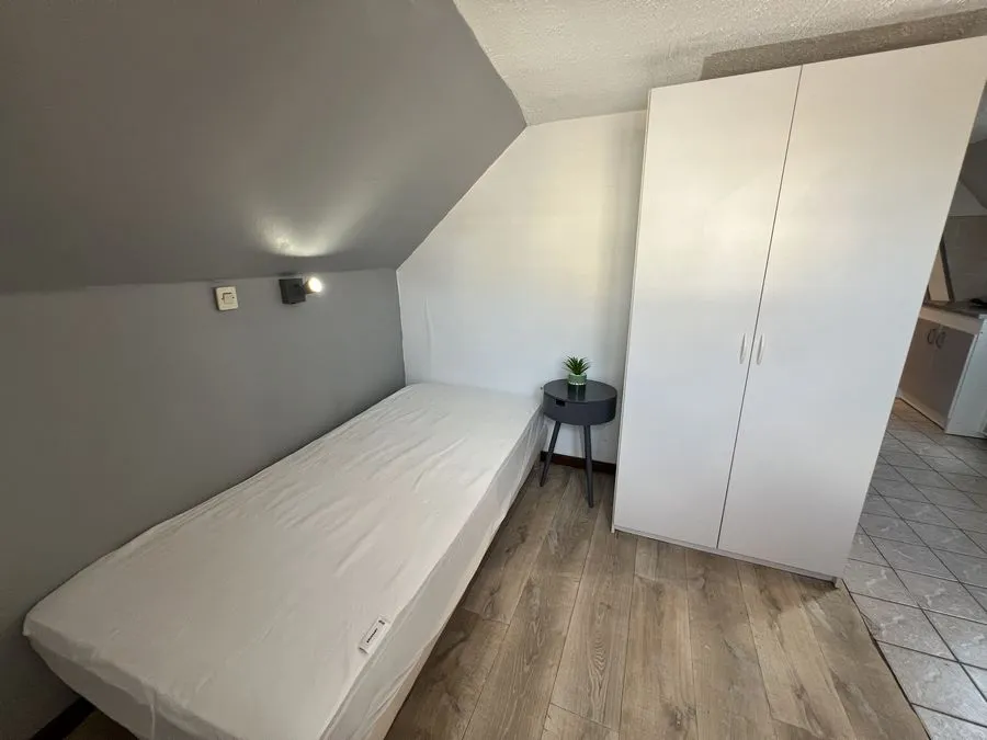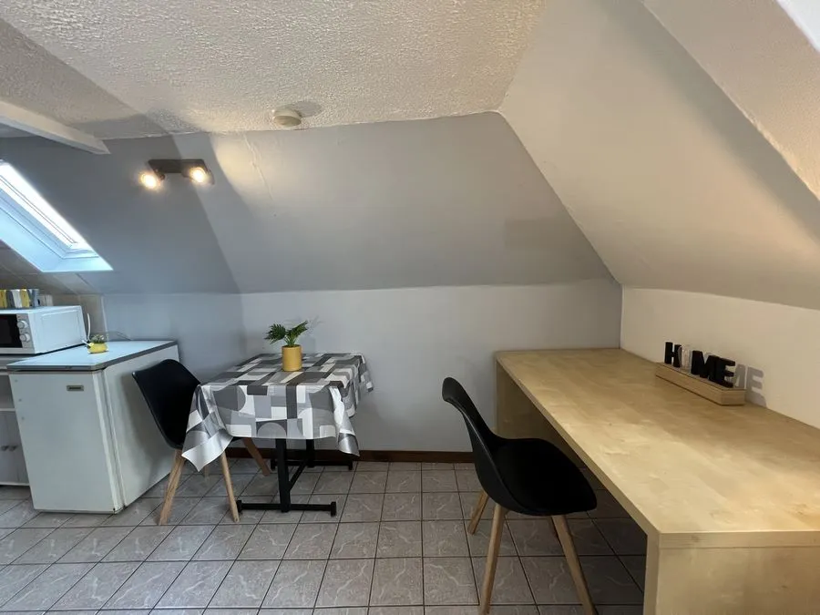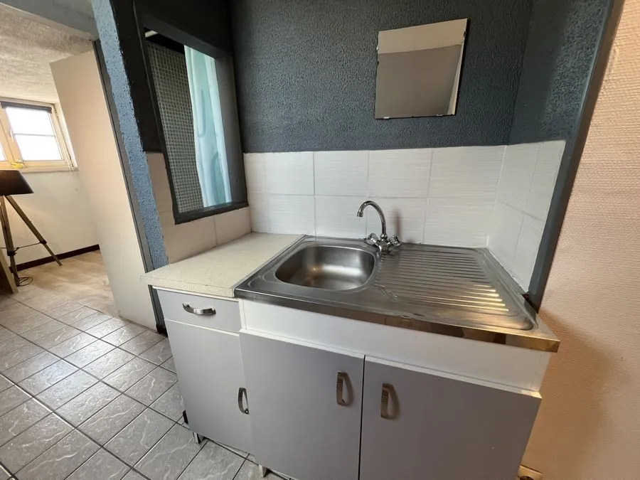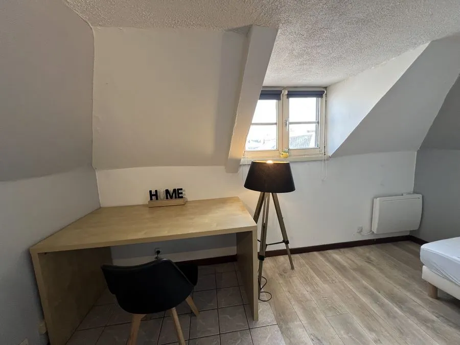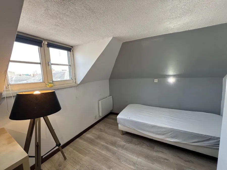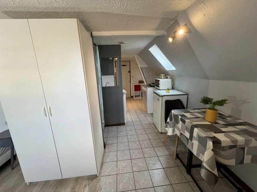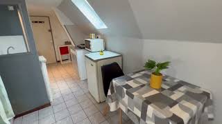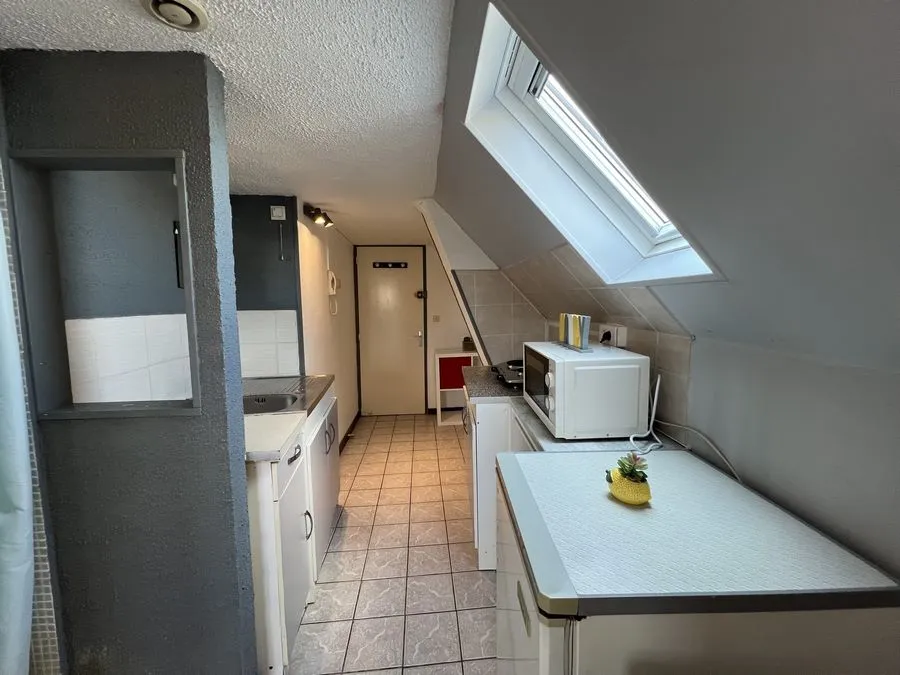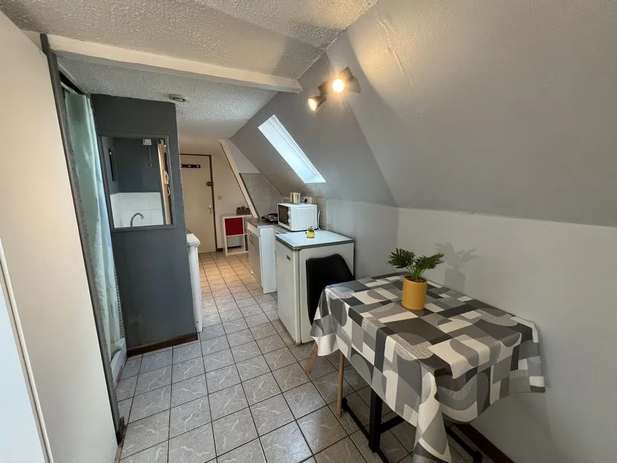 Il se compose d'une pièce à vivre entièrement carrelée, les murs sont en fibre de verre peints en blanc et gris. Ce studio est muni d'une fenêtre en bois avec store et d'un velux. Vous trouverez une kitchenette équipée carrelée avec un évier, 2 plaques électriques, un frigidaire, une hotte et des meubles de cuisine hauts et bas. L'appartement meublé avec goà»t est composé d'une douche, un lit simple, un bureau, une penderie, kitchenette équipée, rideaux, un meuble d'appoint gris, un luminaire.
