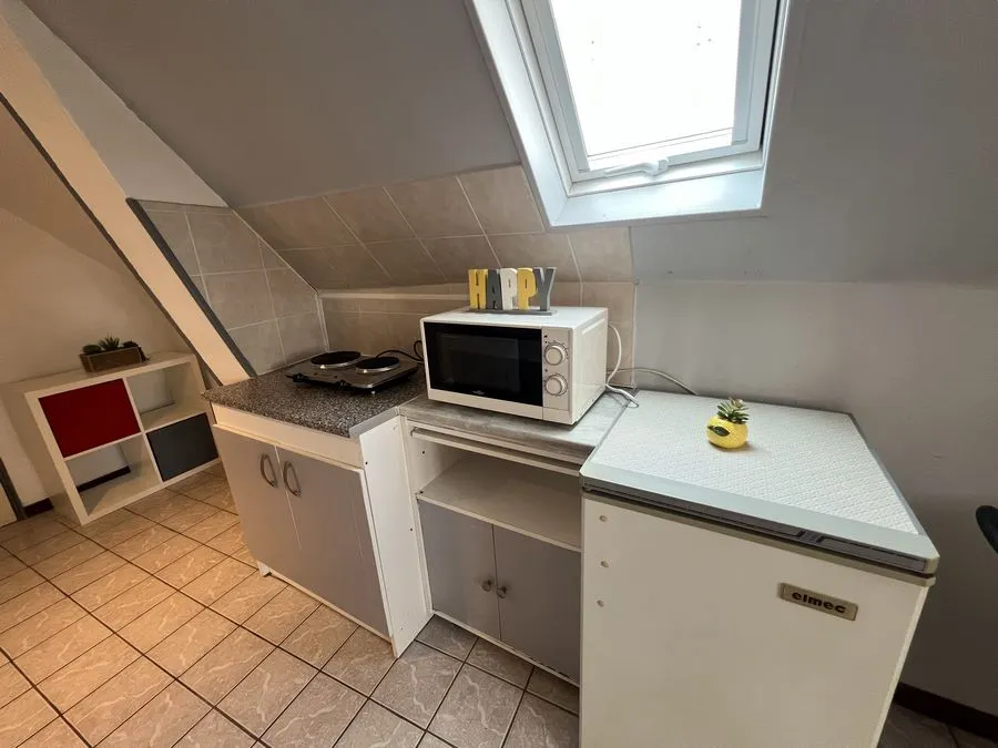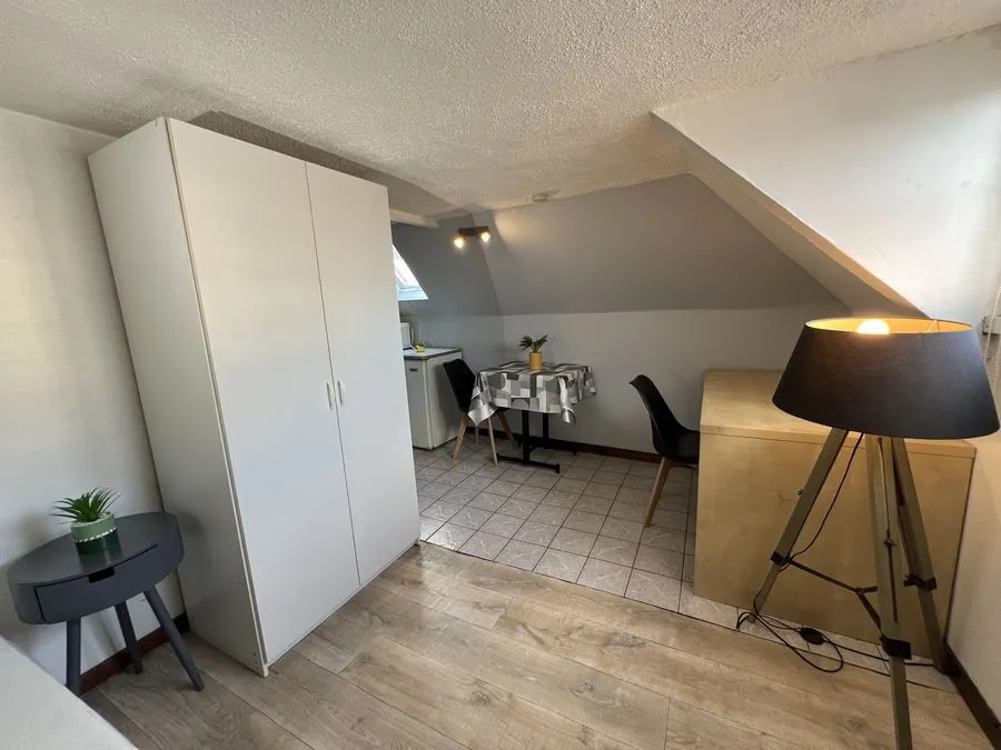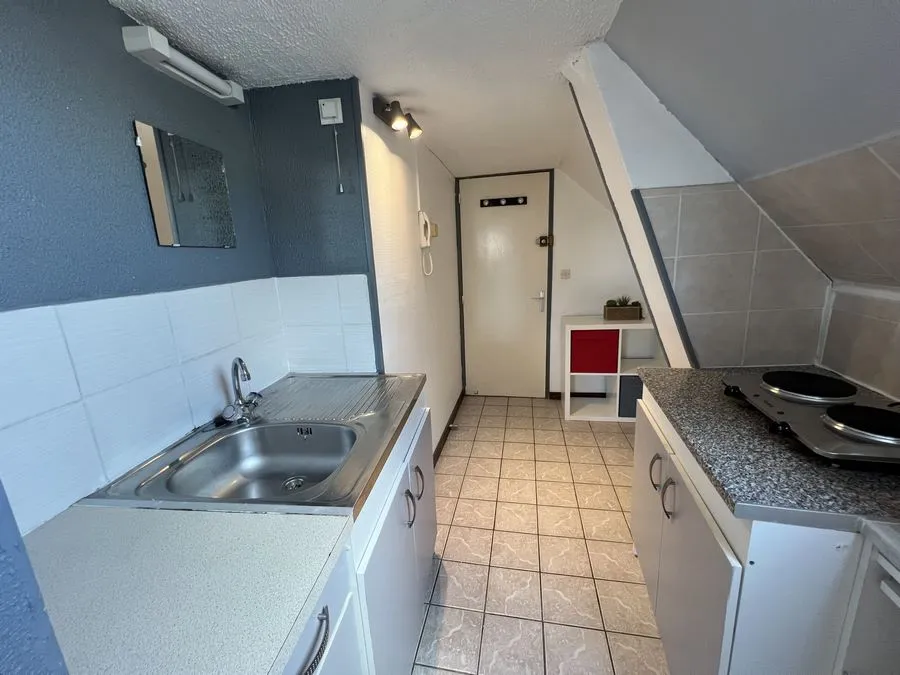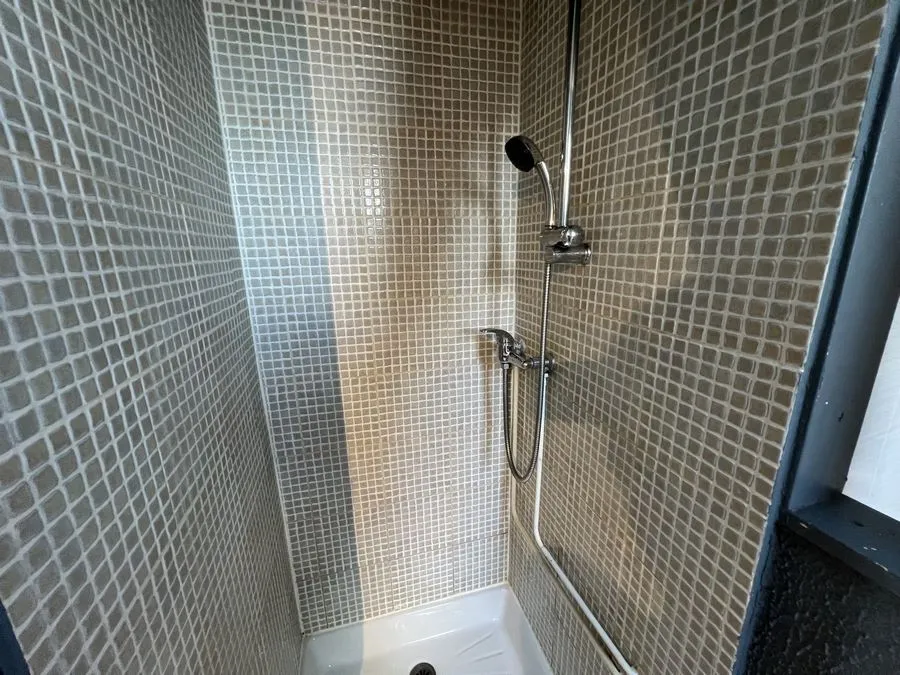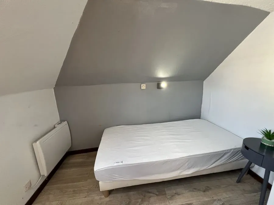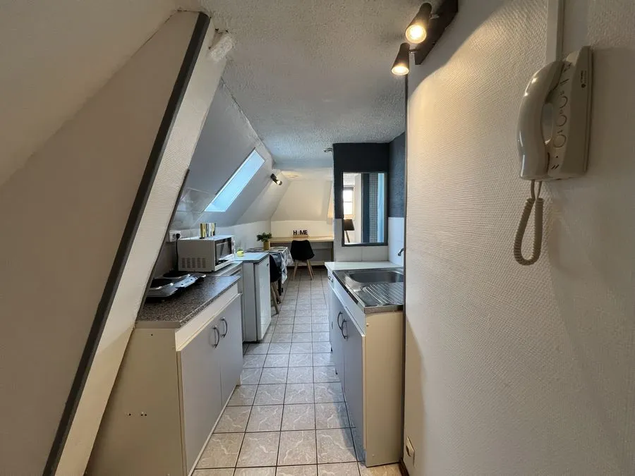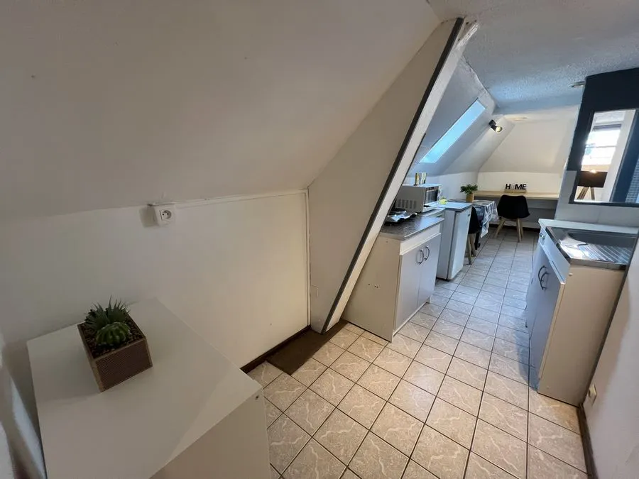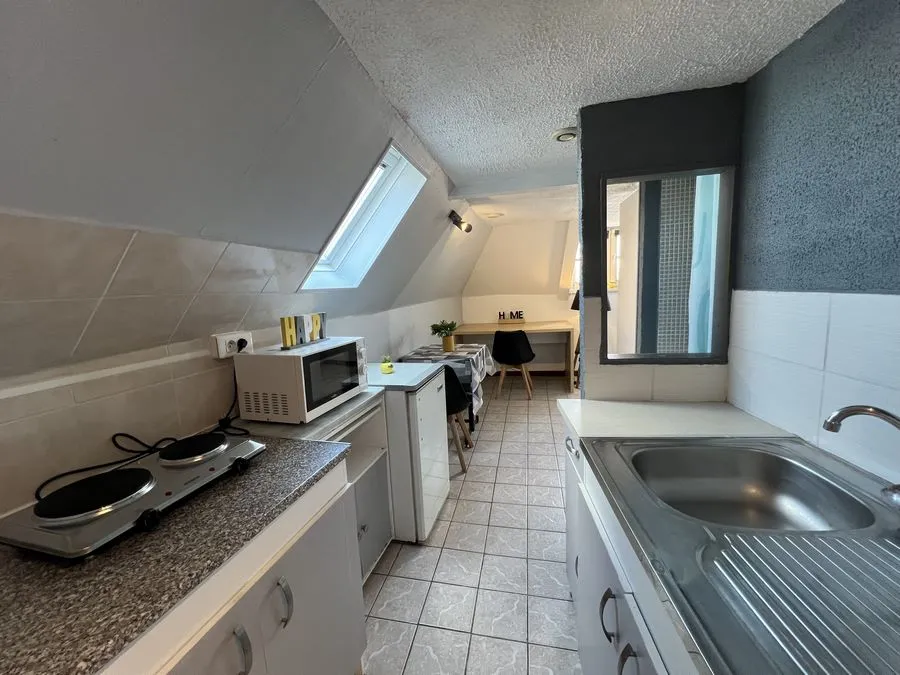 Il se compose d'une pièce à vivre entièrement carrelée, les murs sont en fibre de verre peints en blanc et gris. Ce studio est muni d'une fenêtre en bois avec store et d'un velux. Vous trouverez une kitchenette équipée carrelée avec un évier, 2 plaques électriques, un frigidaire, une hotte et des meubles de cuisine hauts et bas. L'appartement meublé avec goà»t est composé d'une douche, un lit simple, un bureau, une penderie, kitchenette équipée, rideaux, un meuble d'appoint gris, un luminaire.