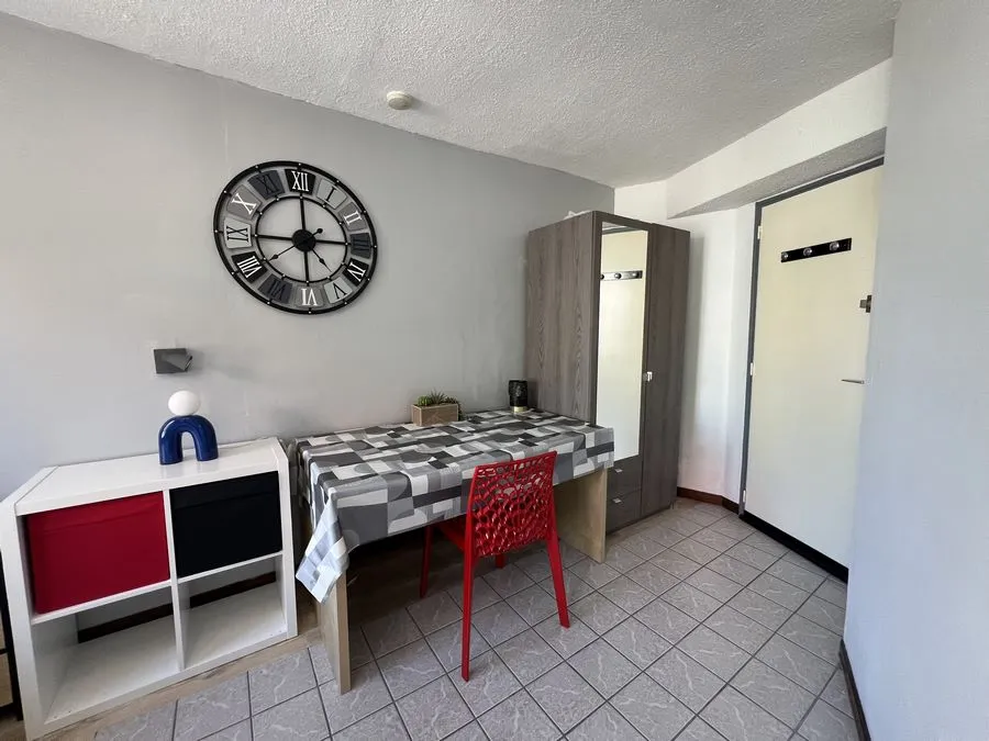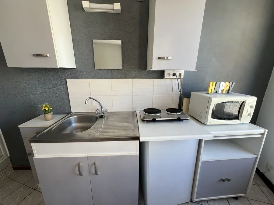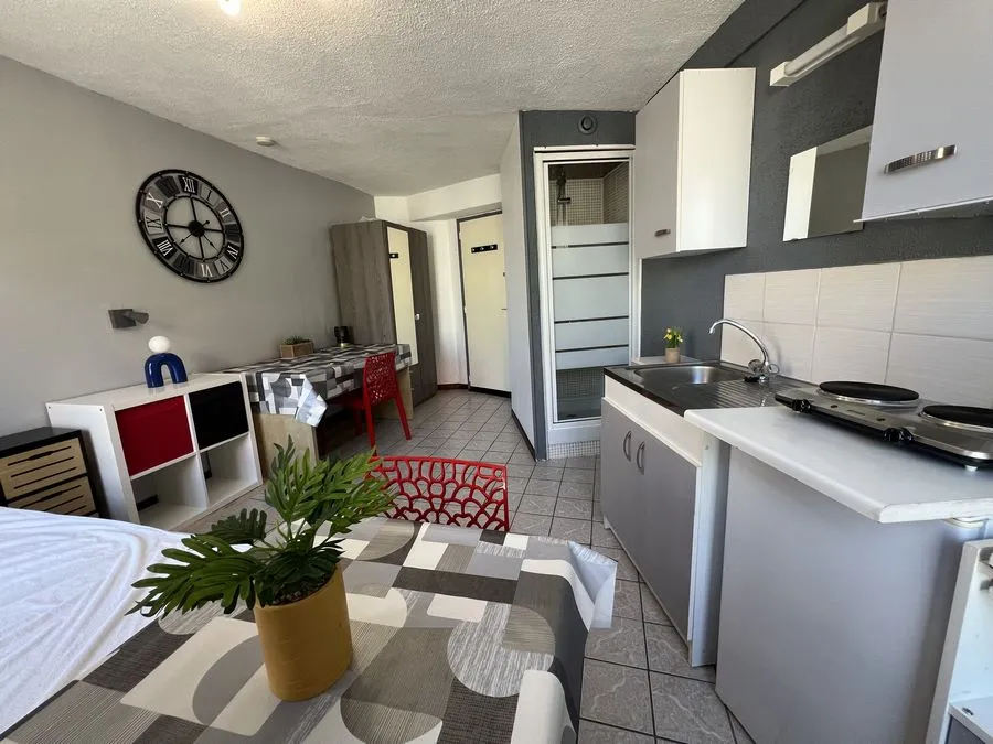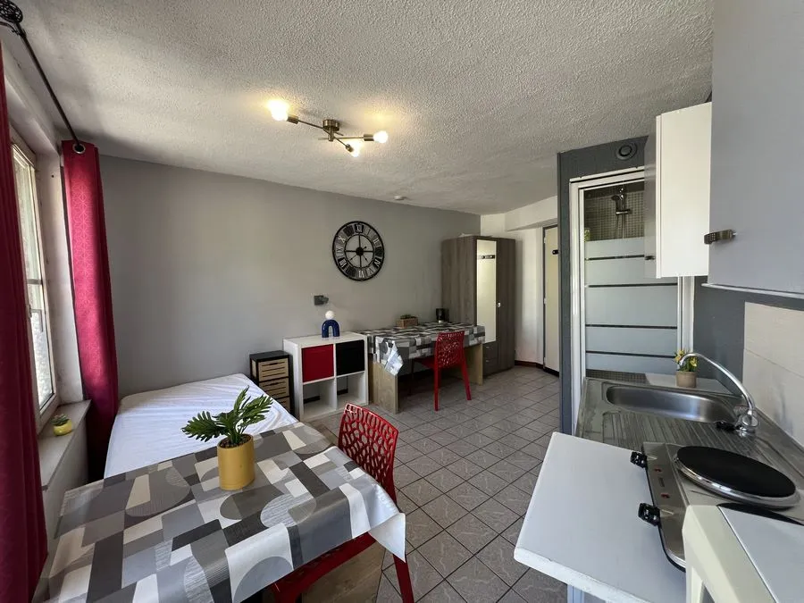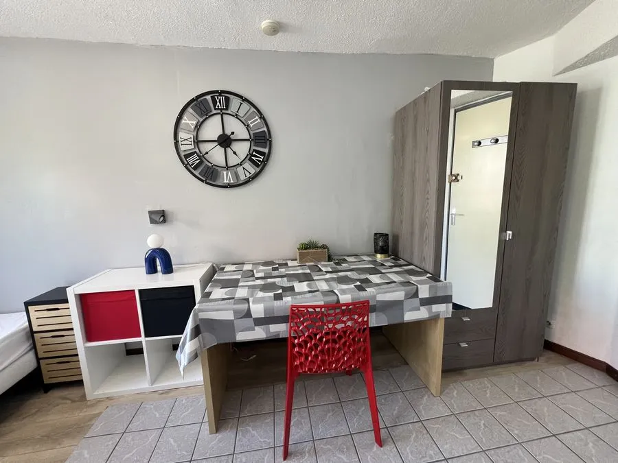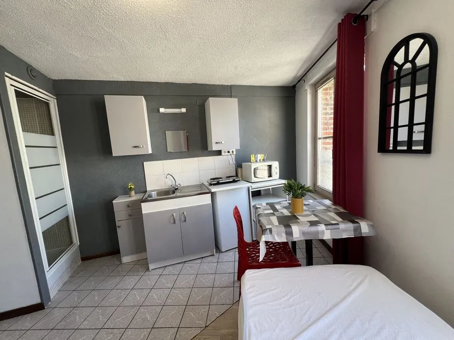 Il se compose d'une pièce à vivre entièrement carrelée, les murs sont en fibre de verre peints en blanc et gris. Ce studio est muni de 2 fenêtre en bois. Vous trouverez une kitchenette équipée carrelée avec un évier, 2 plaques électriques, un frigidaire, une hotte et des meubles de cuisine hauts et bas. L'appartement meublé avec goà»t est composé d'une douche, un lit simple, un bureau, une penderie, kitchenette équipée, rideaux, une table de nuit grise, un meuble d'appoint gris.