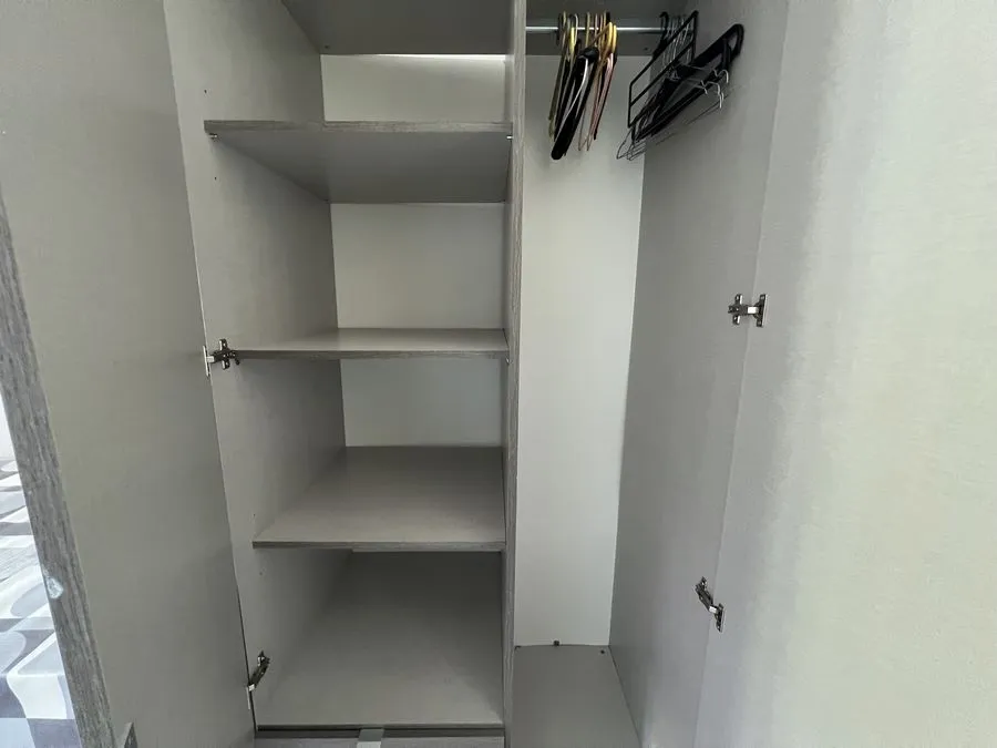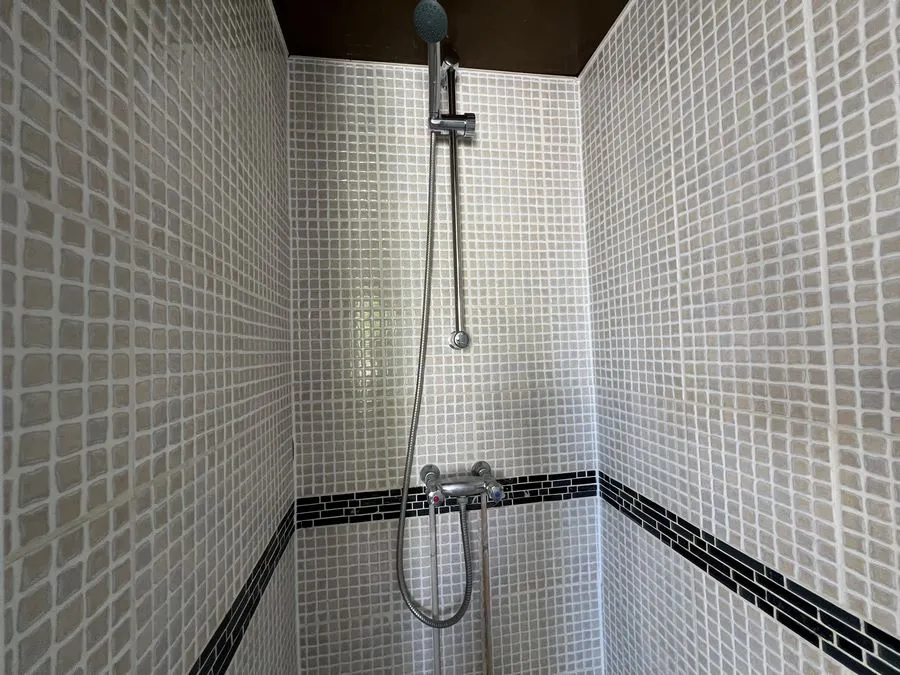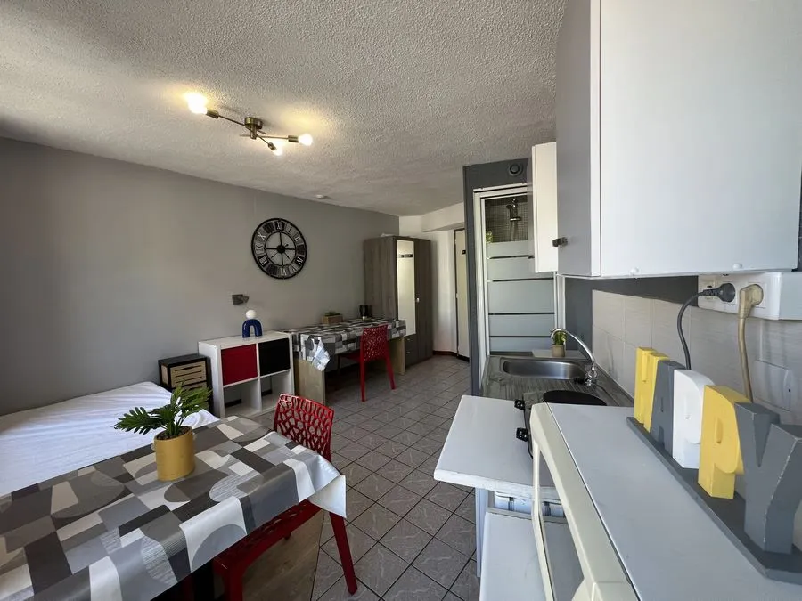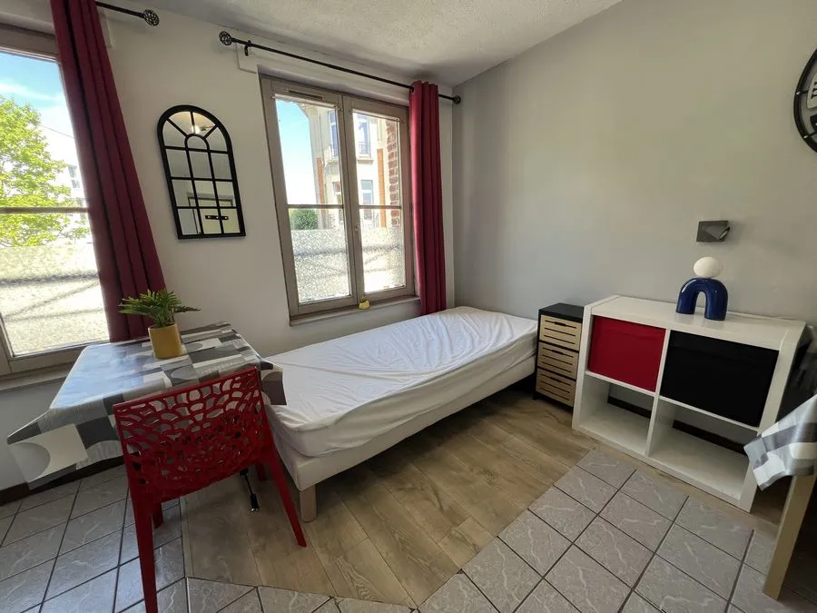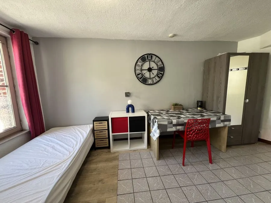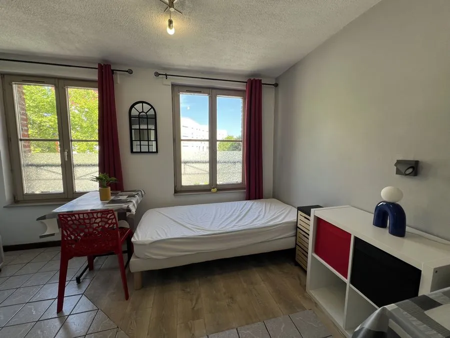 Il se compose d'une pièce à vivre entièrement carrelée, les murs sont en fibre de verre peints en blanc et gris. Ce studio est muni de 2 fenêtre en bois. Vous trouverez une kitchenette équipée carrelée avec un évier, 2 plaques électriques, un frigidaire, une hotte et des meubles de cuisine hauts et bas. L'appartement meublé avec goà»t est composé d'une douche, un lit simple, un bureau, une penderie, kitchenette équipée, rideaux, une table de nuit grise, un meuble d'appoint gris.