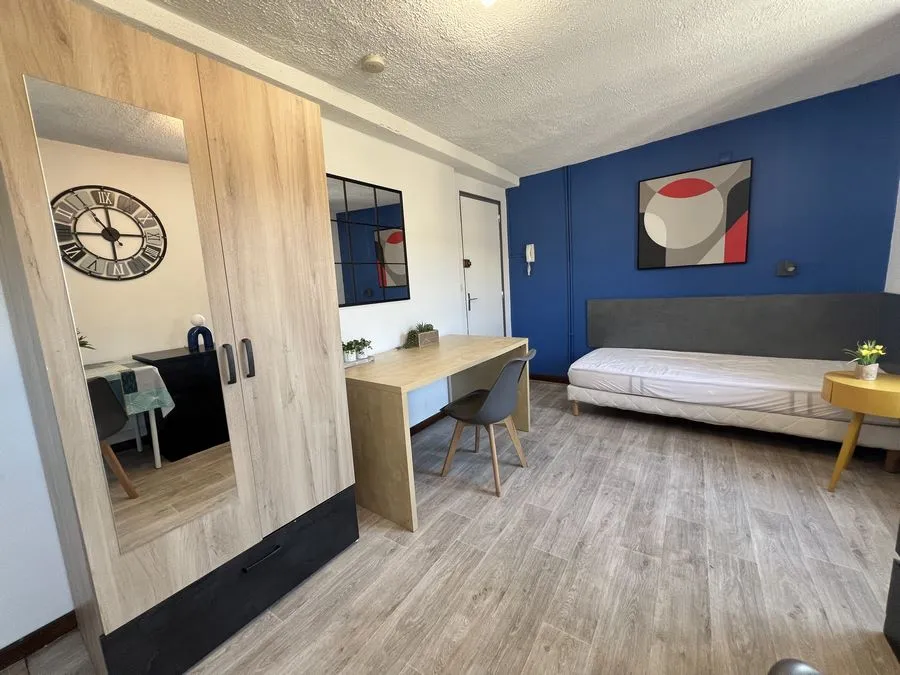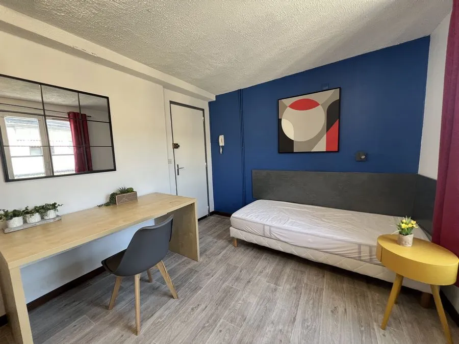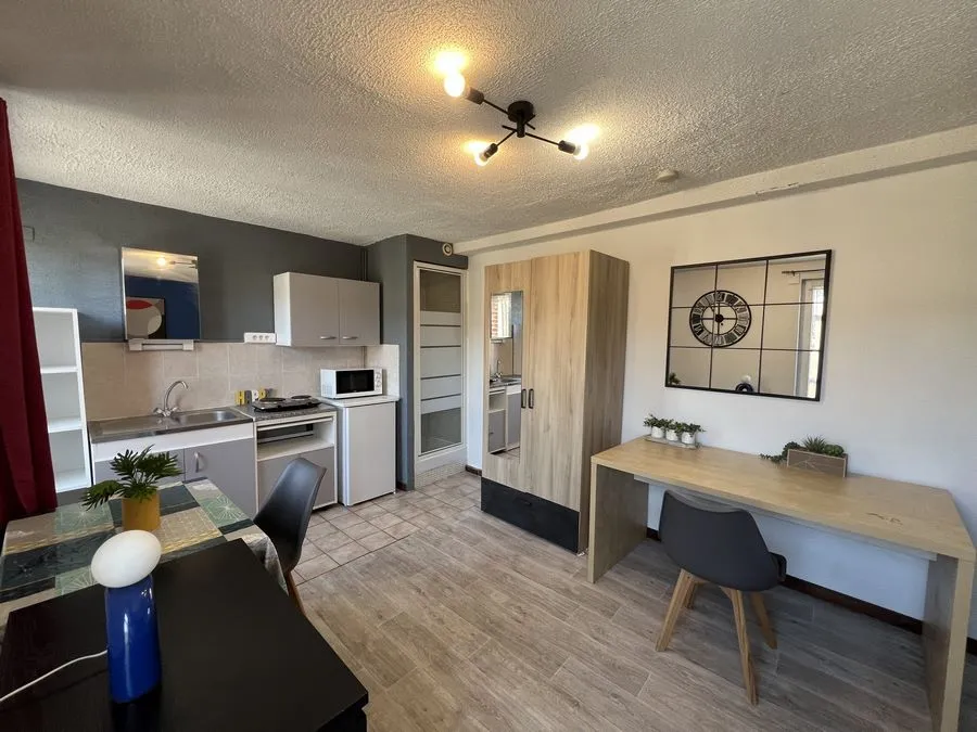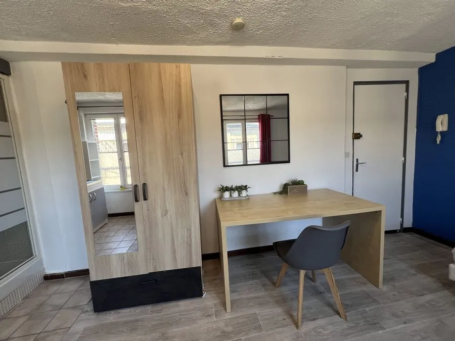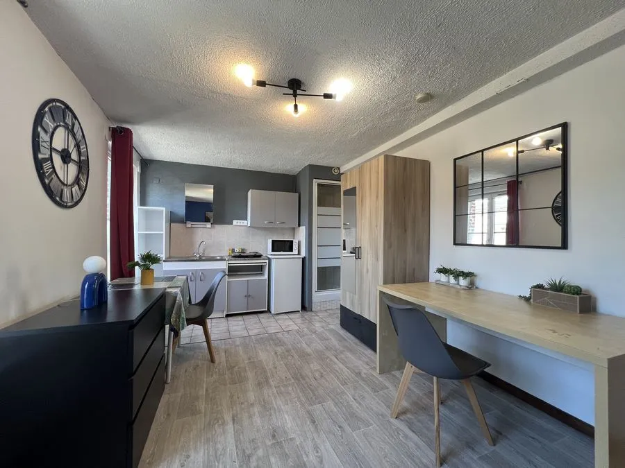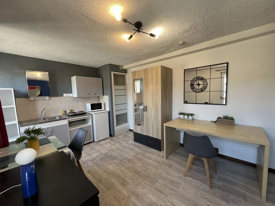 Il se compose d'une pièce à vivre entièrement carrelée, les murs sont en fibre de verre peints en blanc et gris. Ce studio est muni de 2 fenêtres en bois. Vous trouverez une kitchenette équipée carrelée avec un évier, 2 plaques électriques, un frigidaire, une hotte et des meubles de cuisine hauts et bas. L'appartement meublé avec goà»t est composé d'une douche, un lit simple, un bureau, une penderie, kitchenette équipée, rideaux, une table de nuit jaune.