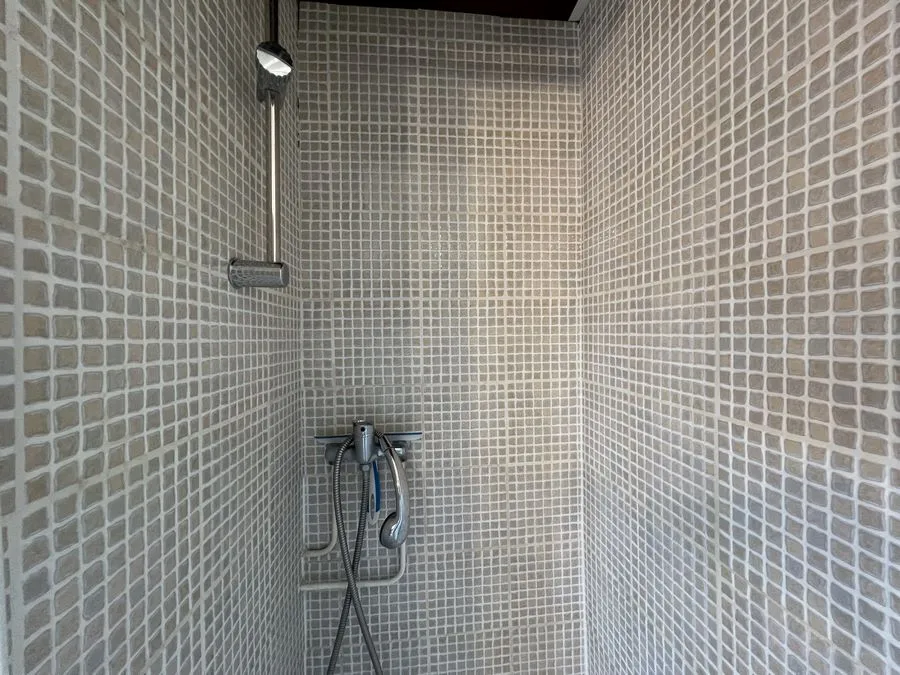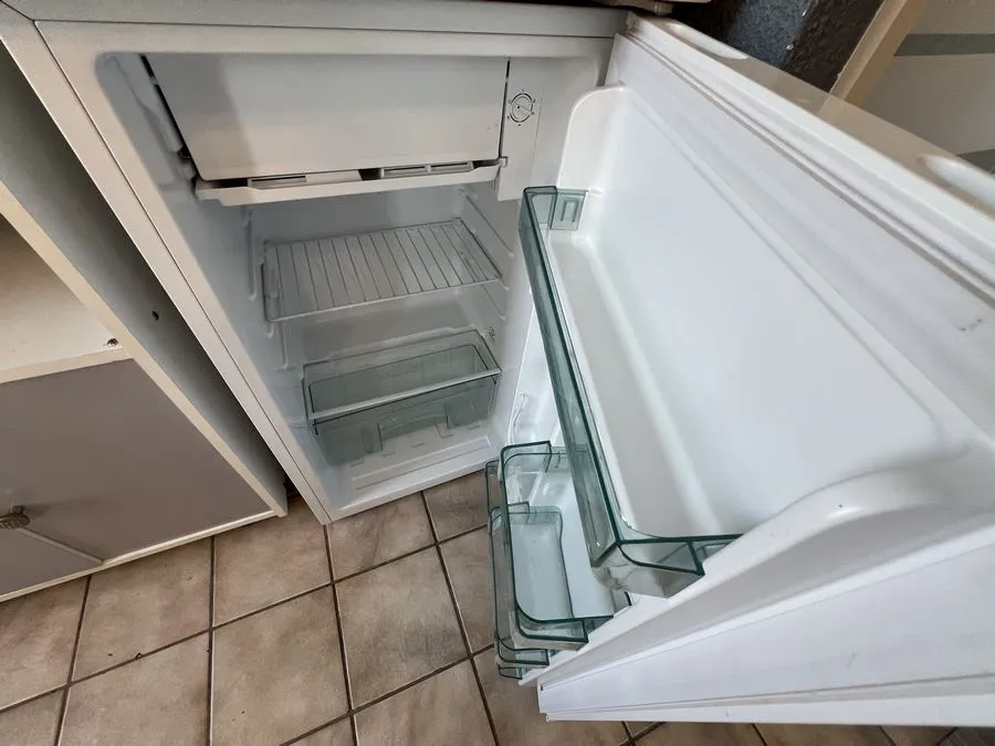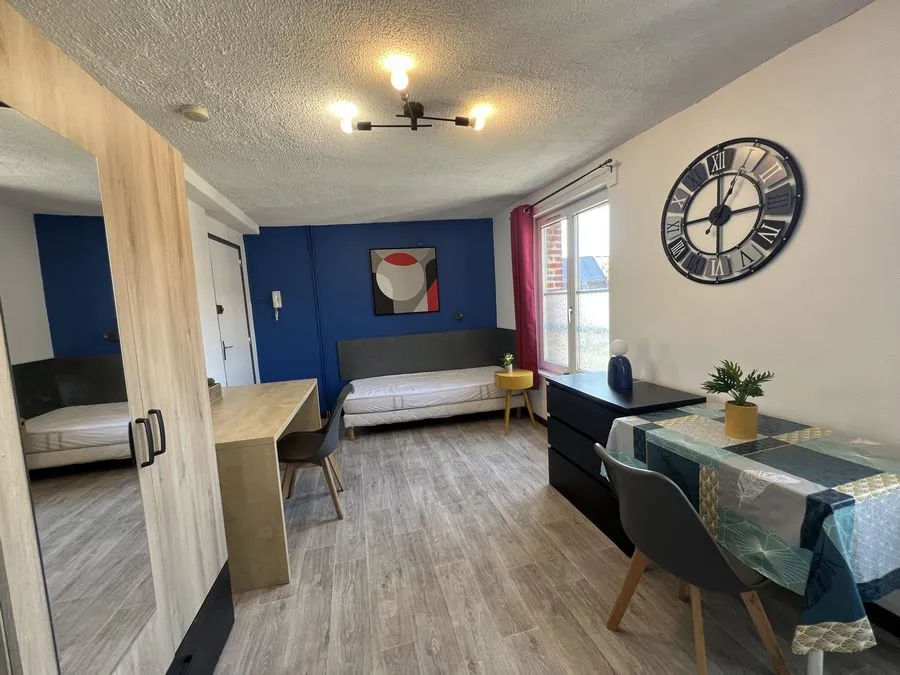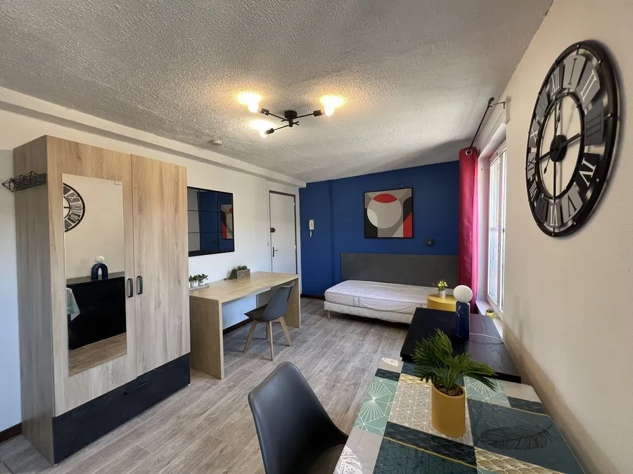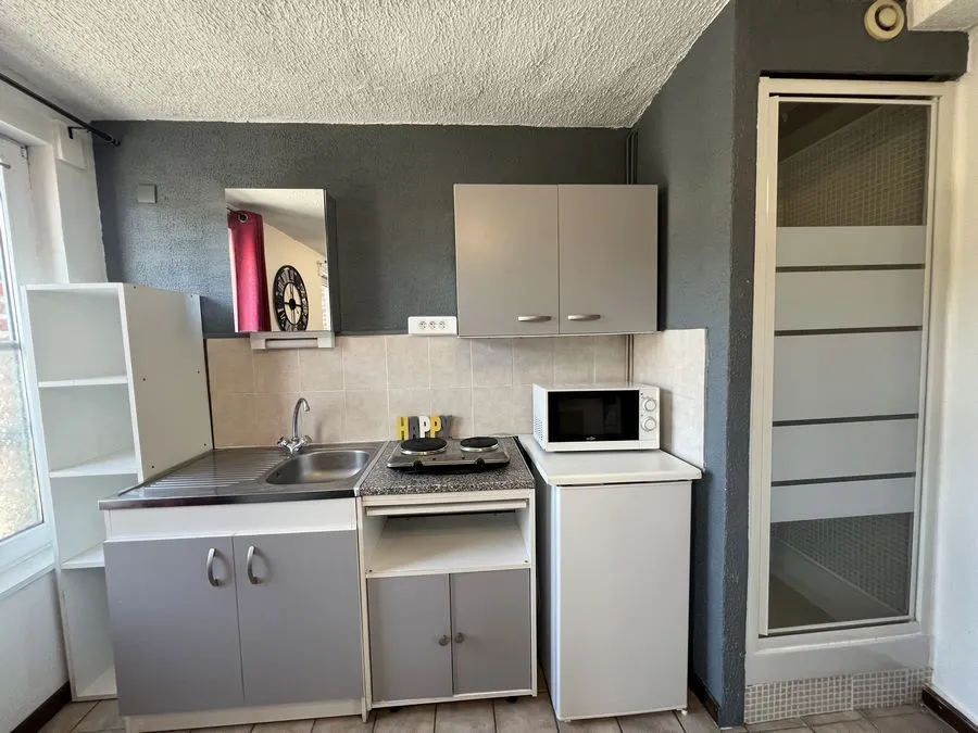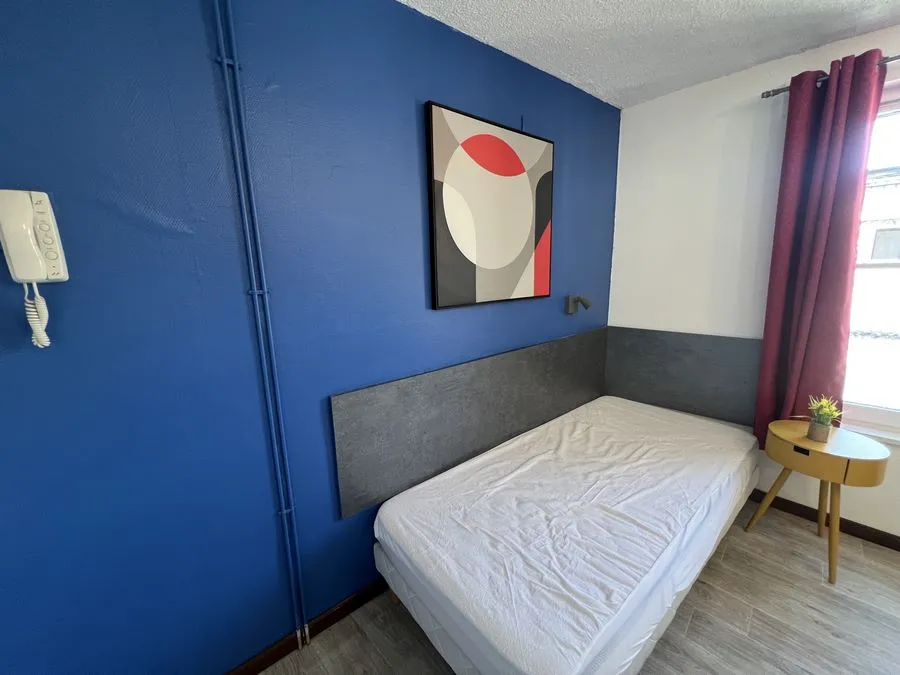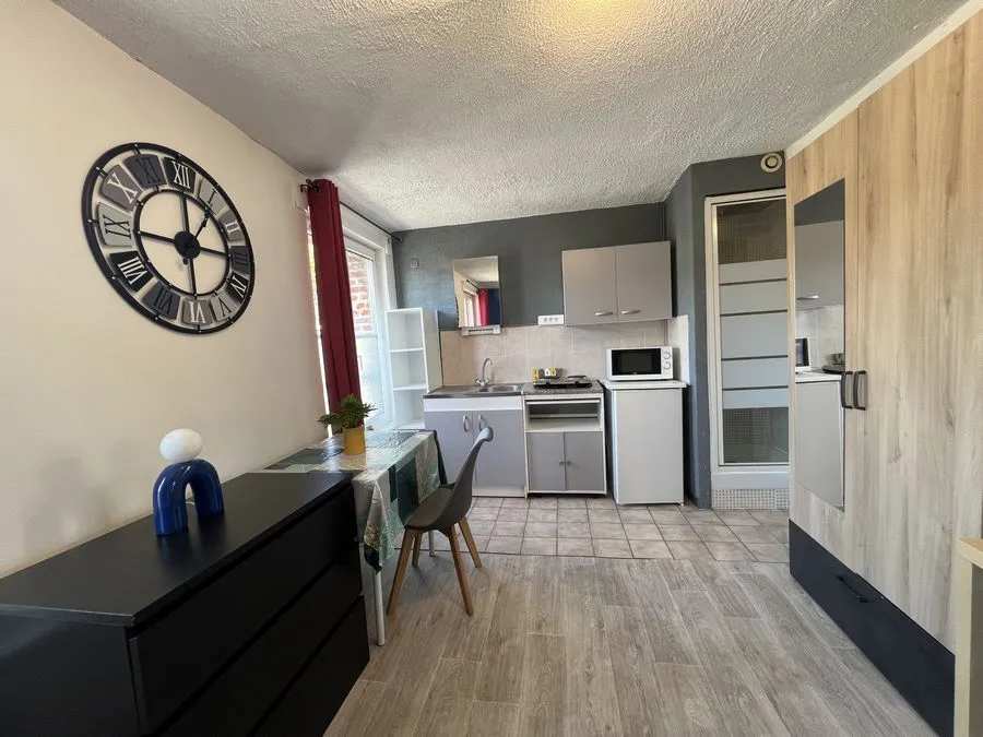 Il se compose d'une pièce à vivre entièrement carrelée, les murs sont en fibre de verre peints en blanc et gris. Ce studio est muni de 2 fenêtres en bois. Vous trouverez une kitchenette équipée carrelée avec un évier, 2 plaques électriques, un frigidaire, une hotte et des meubles de cuisine hauts et bas. L'appartement meublé avec goà»t est composé d'une douche, un lit simple, un bureau, une penderie, kitchenette équipée, rideaux, une table de nuit jaune.