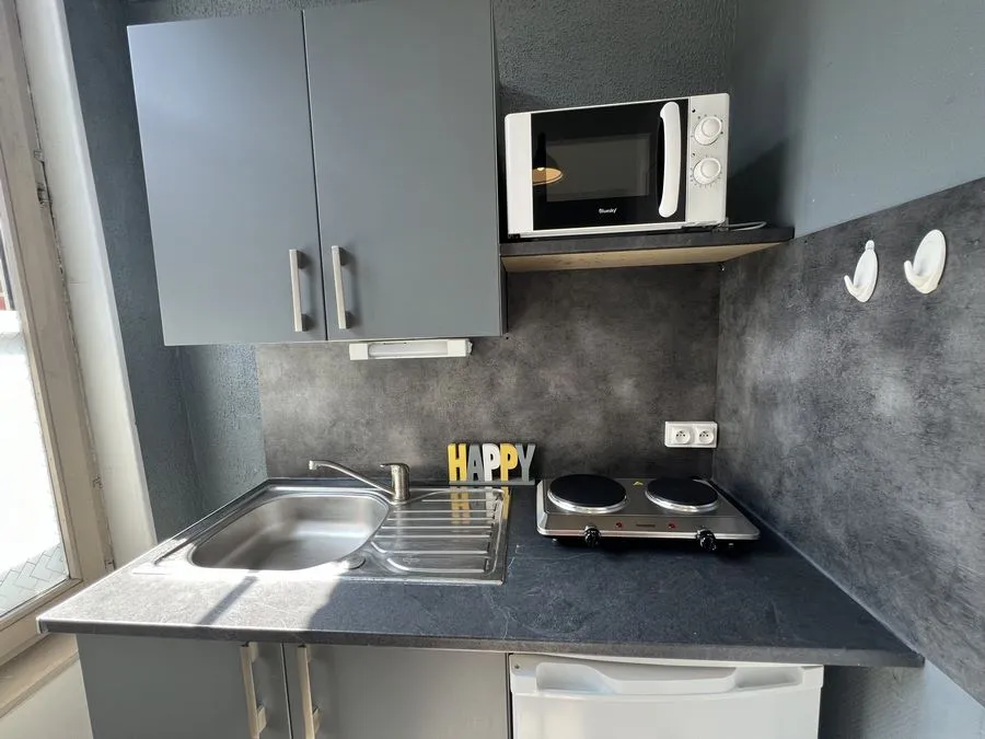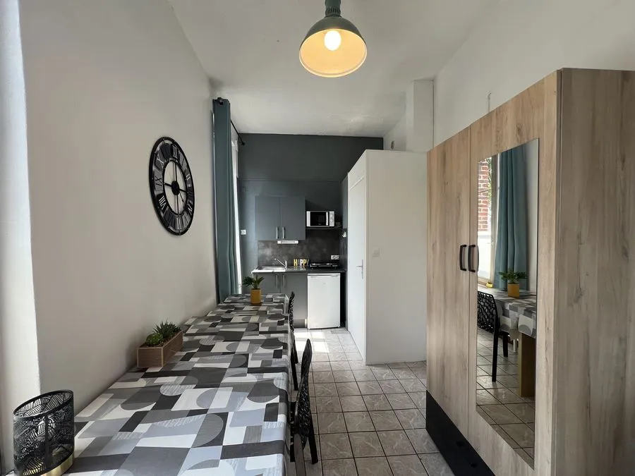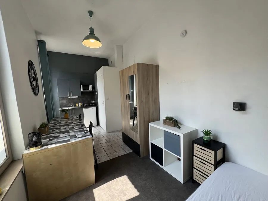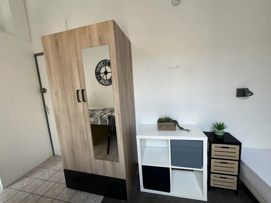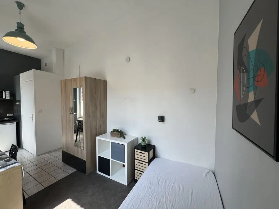 Il se compose d'une pièce à vivre entièrement carrelée, les murs sont en fibre de verre peints en blanc et gris. Ce studio est muni de 2 grandes fenêtres en bois. L'appartement possède énormément de lumière grâce à ses grandes fenêtres. Vous trouverez une kitchenette équipée carrelée avec un évier, 2 plaques électriques, un frigidaire, une hotte et des meubles de cuisine hauts et bas. L'appartement meublé avec goà»t est composé d'une douche, un lit simple, un bureau, une penderie, kitchenette équipée, rideaux, une table de nuit bois et noire, une lampe de chevet.
