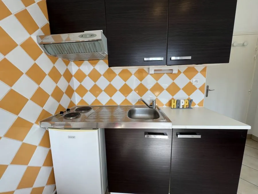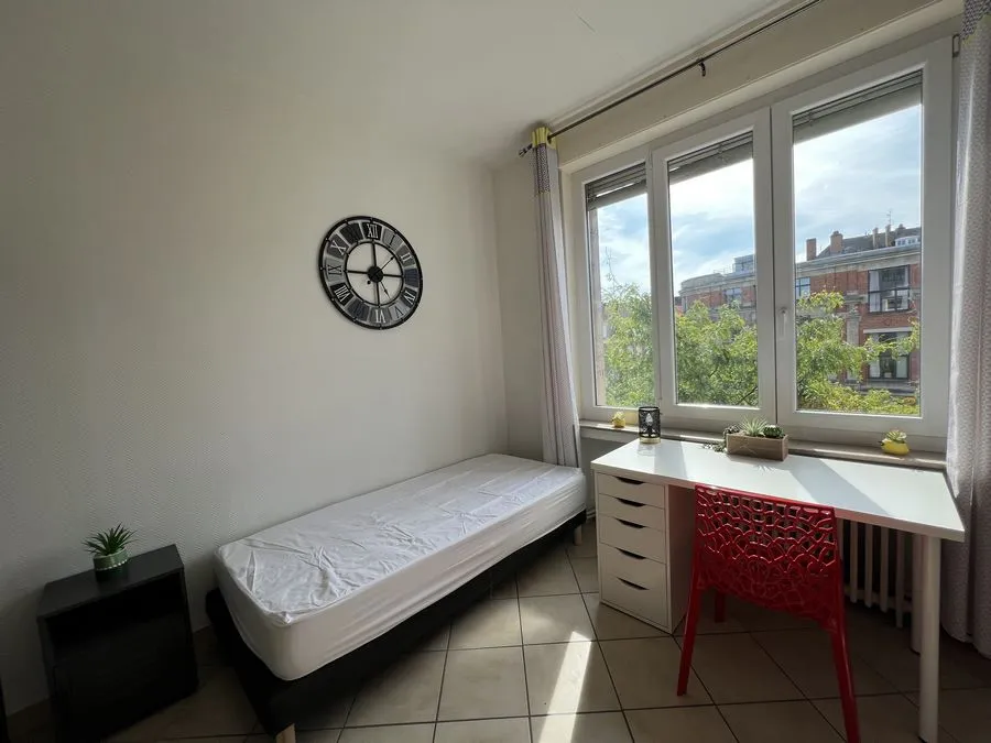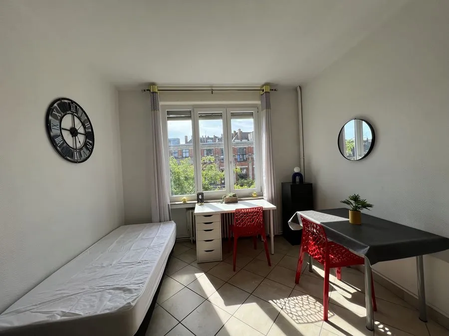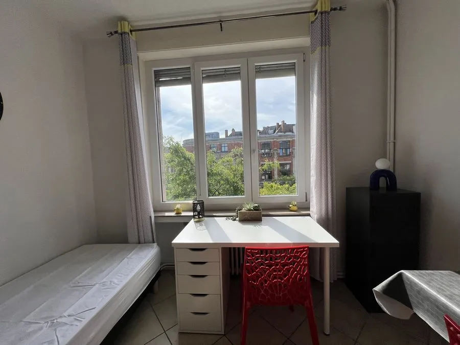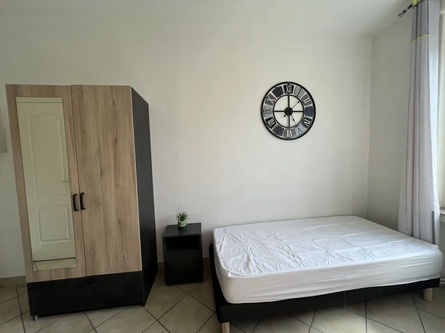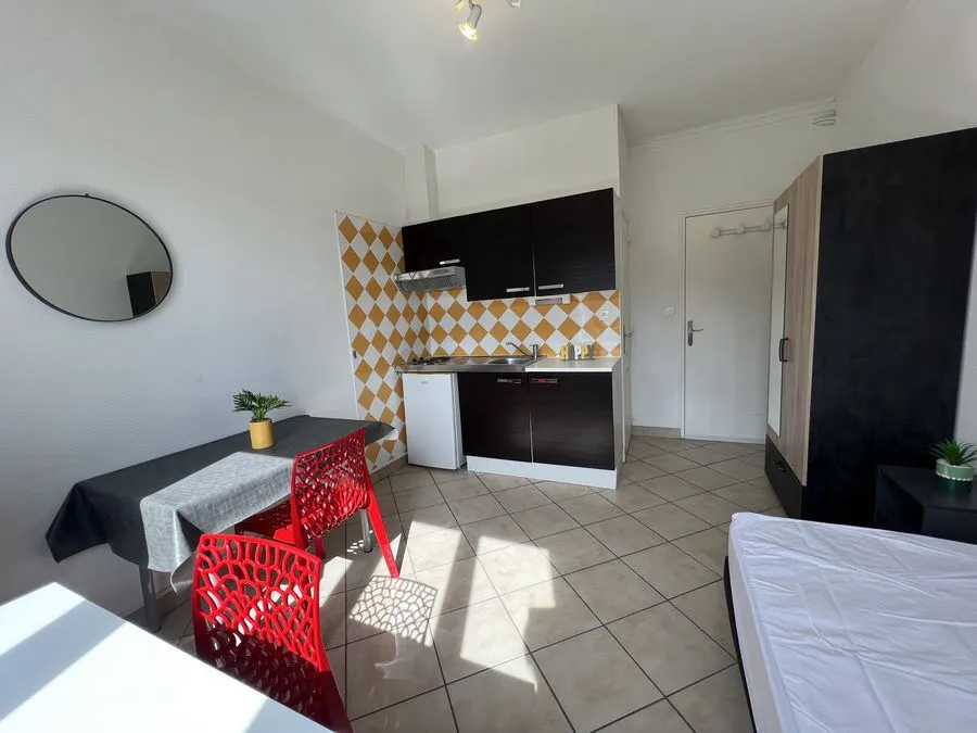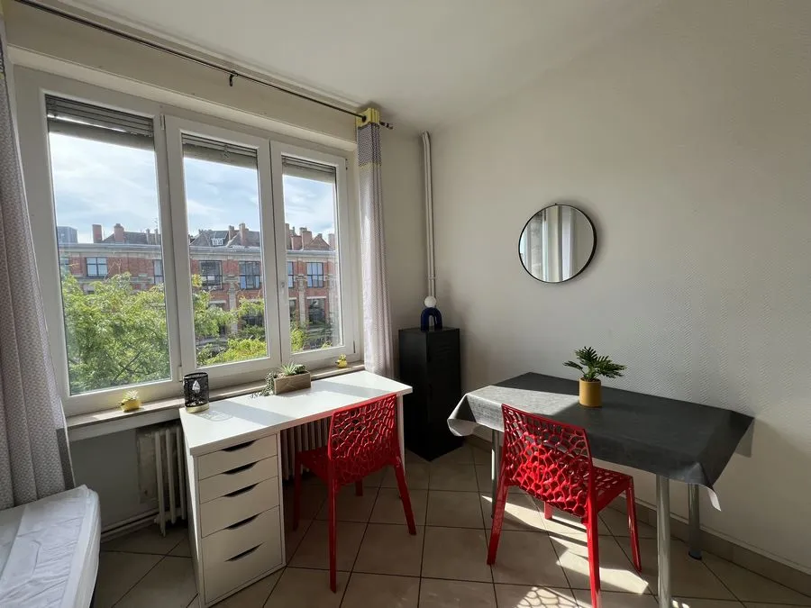 Il se compose d'une pièce à vivre carrelée et d'une grande fenêtre en double vitrage avec volets. Les murs sont en fibre de verre peints en blanc. Vous trouverez une cuisine équipée carrelée avec un évier, 2 plaques électriques, un frigidaire, une hotte et des meubles de cuisine hauts et bas. La salle de douche est carrelée avec une vasque, elle possède une douche, un lavabo et un toilette. L'appartement meublé avec goà»t est composé d'une paire de rideaux, une table, 2 chaises grises, un lit simple, une penderie bois et noire, un miroir murale, une horloge murale, un bureau blanc, une table de nuit noire et un meuble de rangement noir. Le chauffage central gaz est compris.