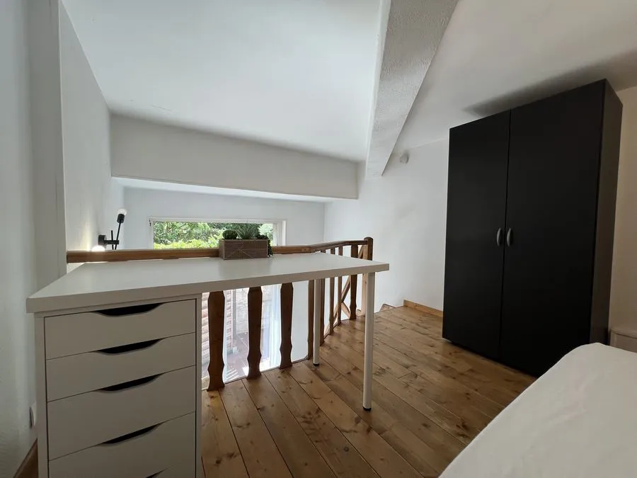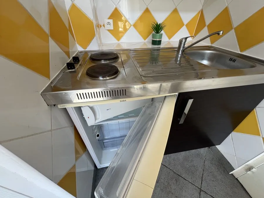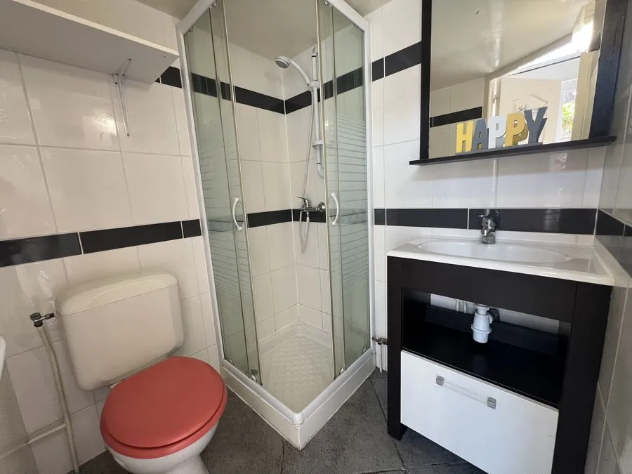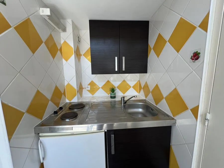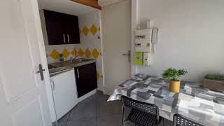 Il se compose d'une pièce à vivre carrelée avec une grande porte-fenêtre en double vitrage avec volet donnant sur une petite terrasse privative. Les murs sont en fibre de verre peints en blanc. Vous trouverez une cuisine équipée carrelée avec un évier, 2 plaques électriques, un frigidaire, une hotte et des meubles de cuisine hauts et bas. La salle de douche est carrelée avec une vasque, elle possède une douche, un lavabo et un toilette. L'appartement meublé avec goà»t est composé d'un bureau, table et chaises, un lit simple, une penderie.