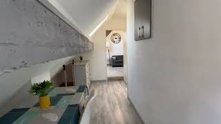 Il se compose d'une pièce à vivre avec parquet et de 2 velux double vitrage. Le salon et la chambre possède également un velux. Les murs sont en fibre de verre peints en blanc. L'appartement possède énormément de lumière grâce à ses nombreux velux. Vous trouverez une cuisine équipée carrelée avec un évier, 2 plaques électriques, un frigidaire, une hotte et des meubles de cuisine hauts et bas. La salle de douche est carrelée avec une vasque, elle possède une machine à laver, une douche, un lavabo et un toilette. L'appartement meublé avec goà»t est composé d'un bureau, table et chaises, un lit double, un portant à vêtement, une commode, un canapé gris 2 places, un luminaire, une table basse, un tabouret, une table de nuit grise.