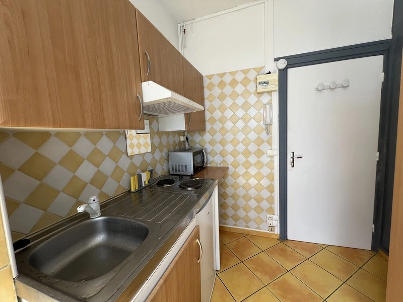 Il se compose d'une pièce à vivre carrelée et de 2 fenêtres avec stores. Les murs sont en fibre de verre peints en blanc. Vous trouverez une cuisine équipée carrelée avec un évier, 2 plaques électriques, un frigidaire, un micro-ondes, une hotte et des meubles de cuisine hauts et bas. L'appartement meublé avec goût est composé d'une douche, un lit simple, une penderie, un meuble de rangement, une table, une chaise