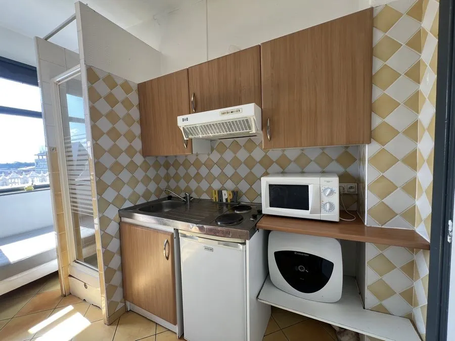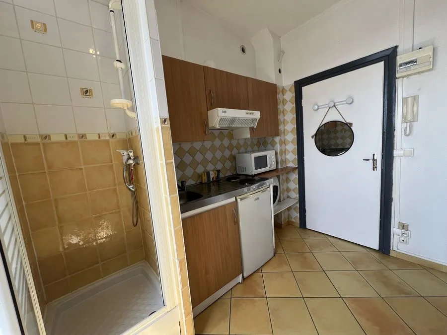 Il se compose d'une pièce à vivre carrelée et de 2 fenêtres avec stores. Les murs sont en fibre de verre peints en blanc et gris. Vous trouverez une cuisine équipée carrelée avec un évier, 2 plaques électriques, un frigidaire, un micro-ondes, une hotte et des meubles de cuisine hauts et bas. L'appartement meublé avec goût est composé d'une douche, une table, 2 chaises, un lit simple, une penderie.