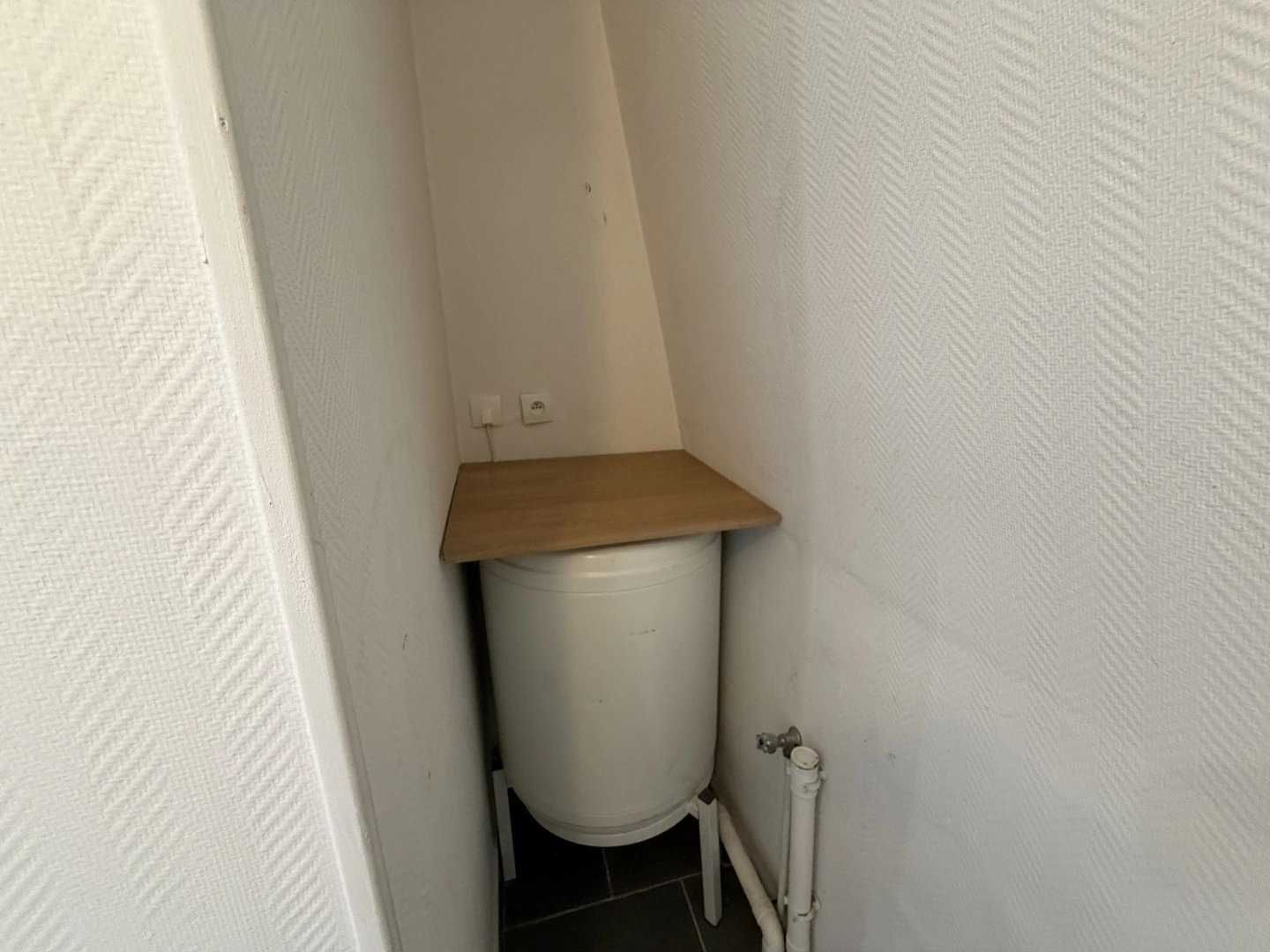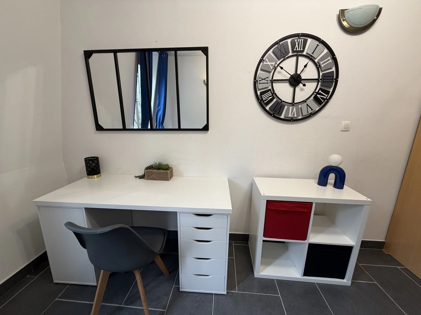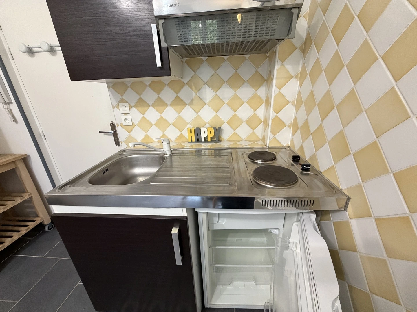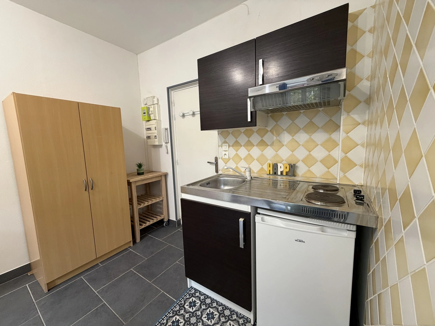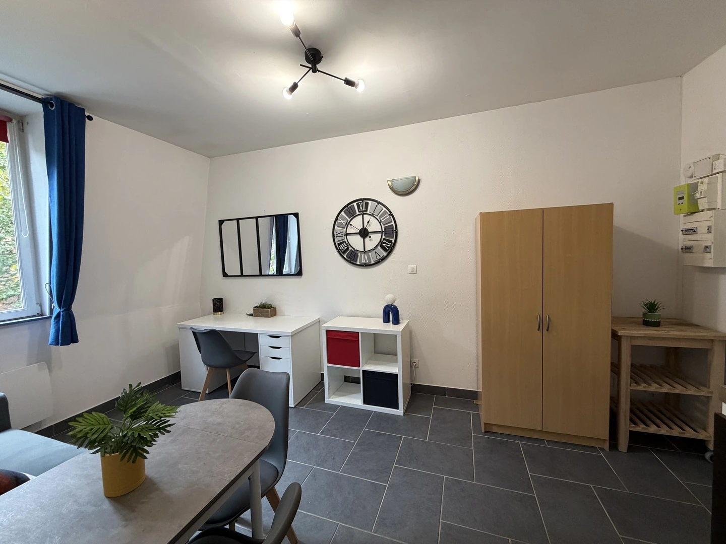 Il se compose d'une pièce à vivre carrelée. L'appartement possède 2 fenêtres en double vitrage avec stores. Les murs sont en fibre de verre peints en blanc. Vous trouverez une cuisine équipée carrelée avec un évier, 2 plaques électriques, un frigidaire, une hotte et des meubles de cuisine hauts et bas. La salle de bain est carrelée avec une vasque, elle possède une douche, un lavabo et un toilette. L'appartement meublé avec goà»t est composé d'une table et de chaises, un lit simple, rideaux, une penderie, un petit meuble de rangement, un bureau.