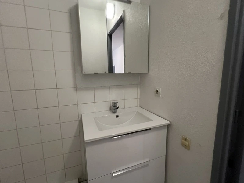 Il se compose d'une pièce à vivre carrelée avec une fenêtre en double vitrage avec volet. Les murs sont en fibre de verre peints en blanc et gris. Vous trouverez une cuisine équipée carrelée avec un évier, 2 plaques électriques, un frigidaire et des meubles de cuisine hauts et bas. La salle de bain est carrelée avec une vasque, elle possède une douche, un lavabo et un toilette. L'appartement meublé avec goà»t est composé d'une table, 2 chaises blanches, un lit simple, une penderie noir et bois, un meuble kalax blanc, une étagère murale blanche, un tableau art abstrait, un bureau noir et bois, un miroir verrière, une table de nuit noire et bois, une horloge murale et une lampe de bureau.