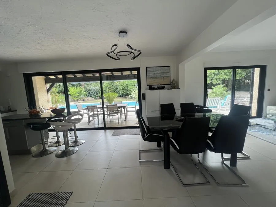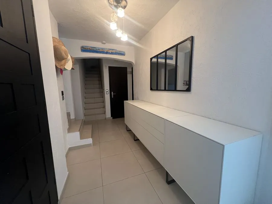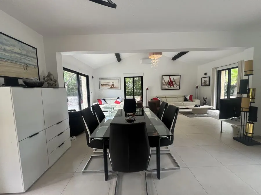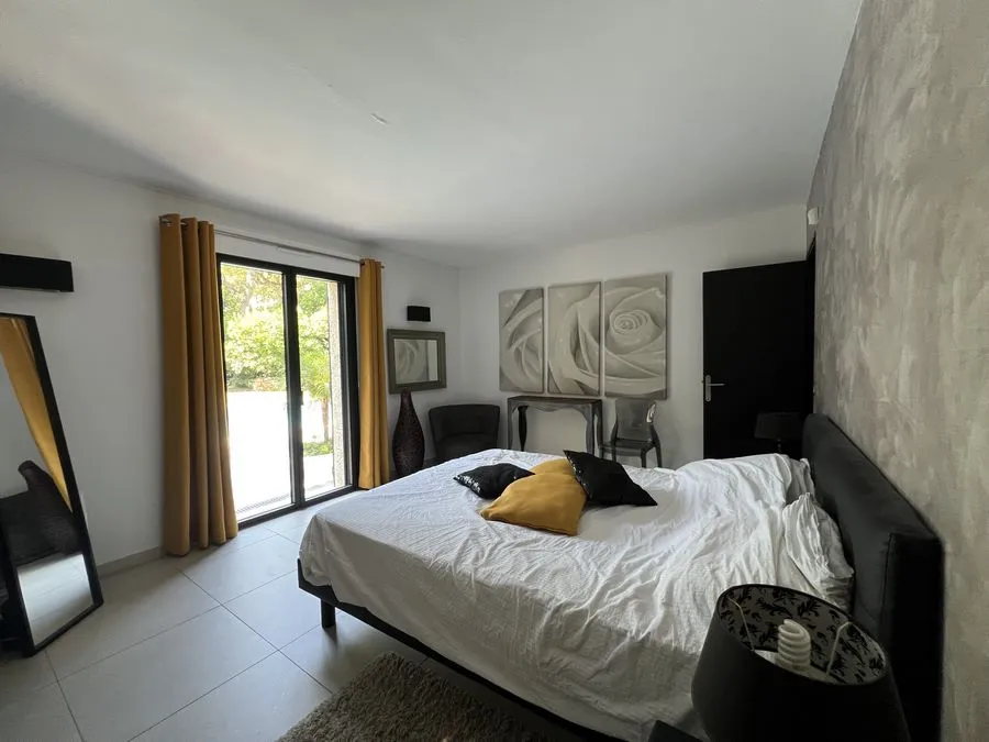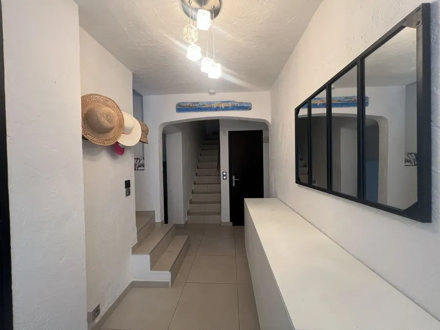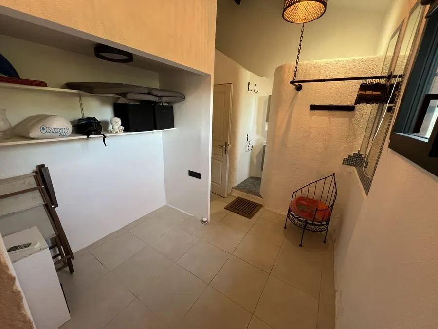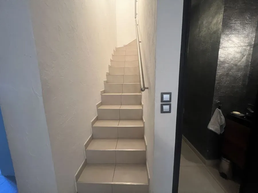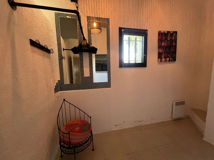 Rez de chaussée : entrée, un salon et salle à manger, cuisine équipée, une piscine, une terrasse, un salon de jardin, un barbecue, jardin clos et arboré. Petite pièce office de débarras rangement, une chambre donnant sur la piscine avec une salle de bain et toilette avec un climatiseur. Toilette au rez de chaussée à droite de l'escalier. Une chambre dîtes marocaine avec douche, un lit double 160x190 qui va être ajouté, en duplex un lit double 160x190 avec climatiseur. Une laverie avec machine à lave, grand frigo, un congélateur.
