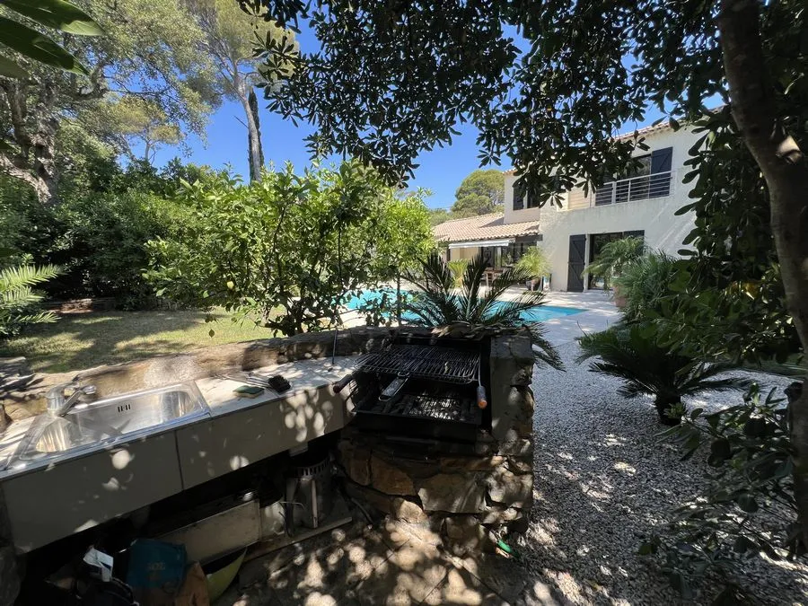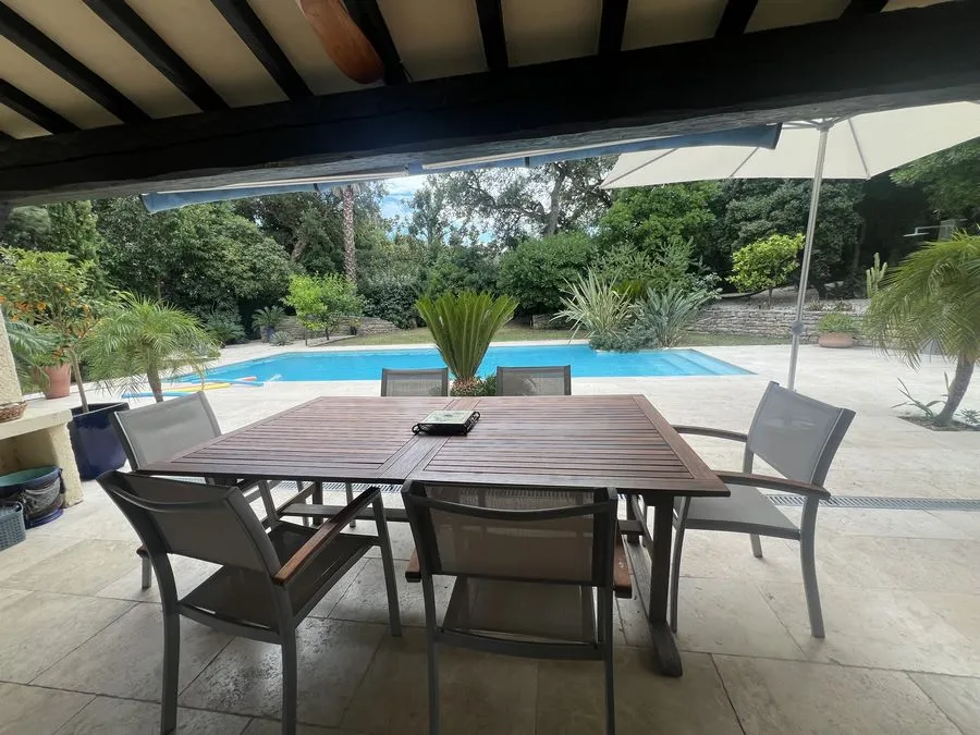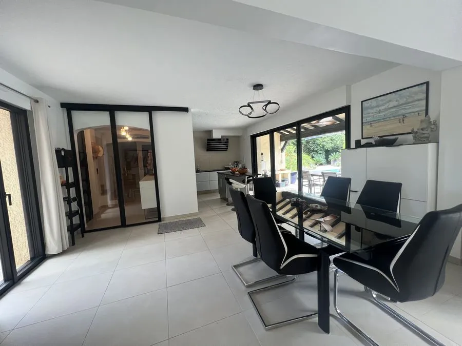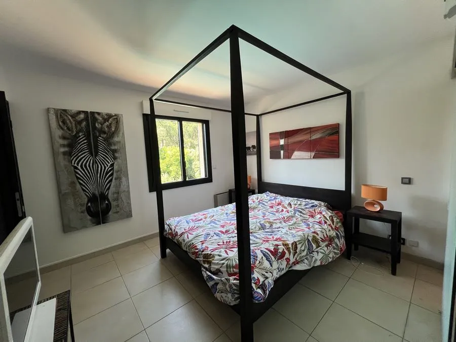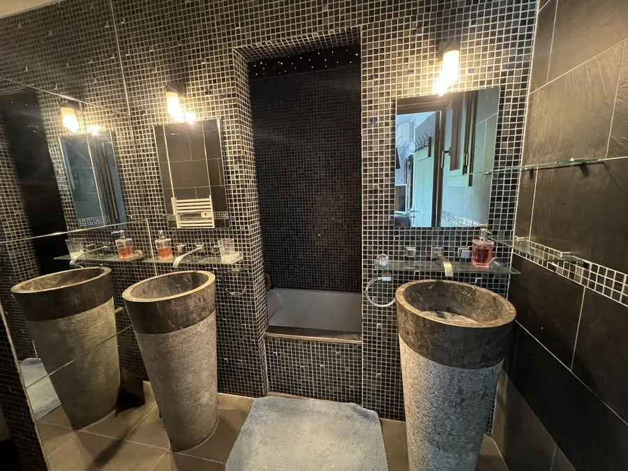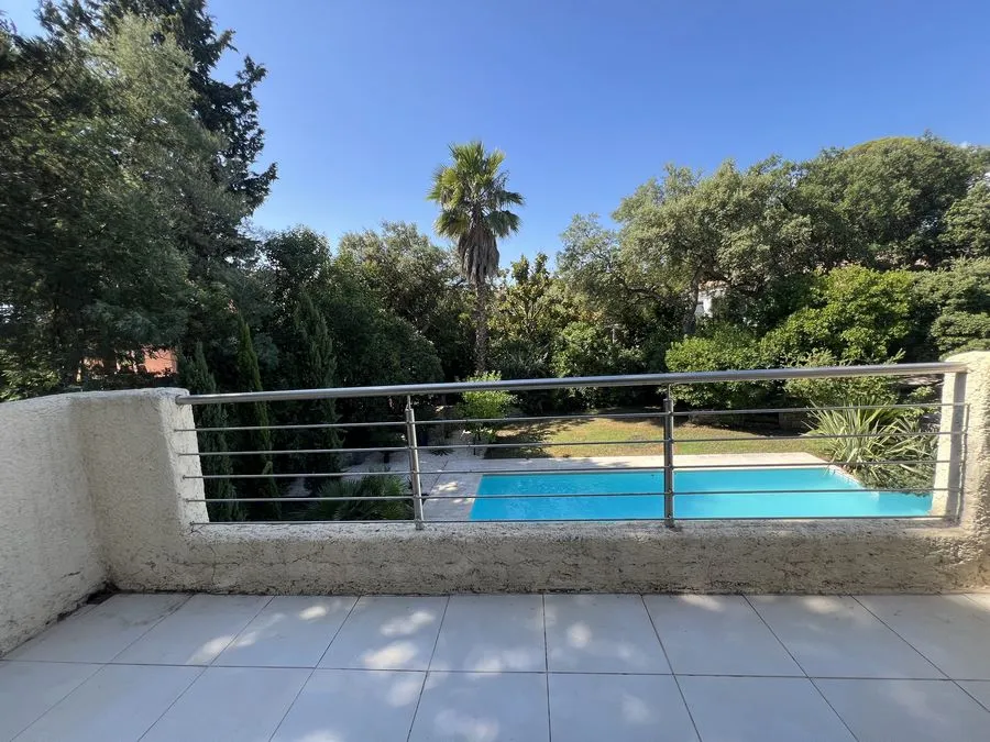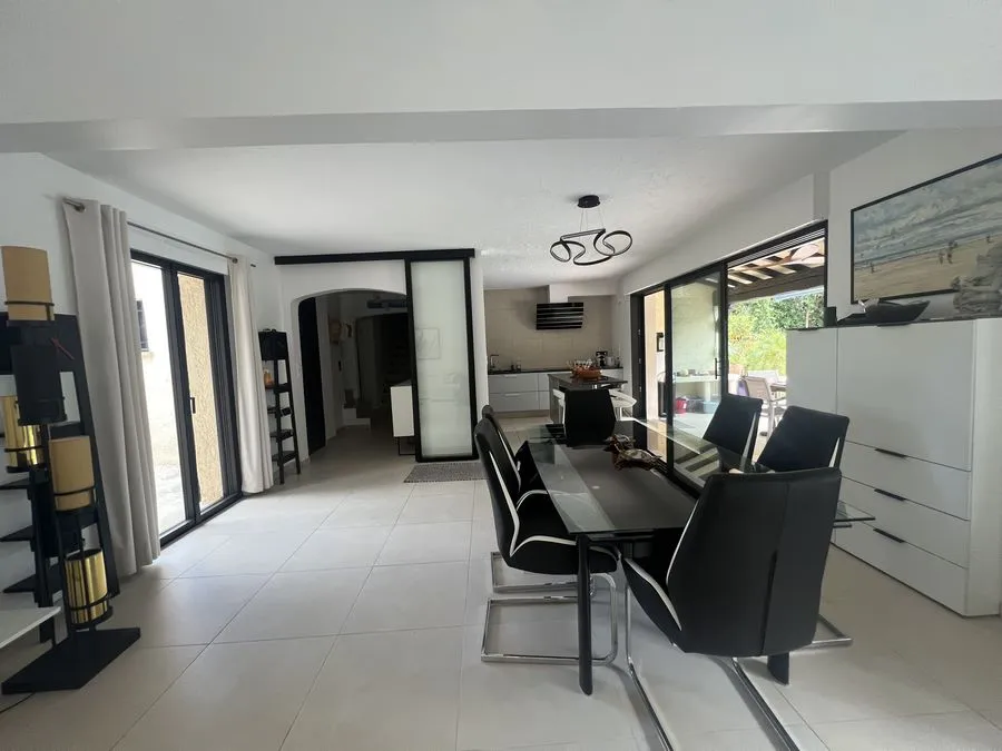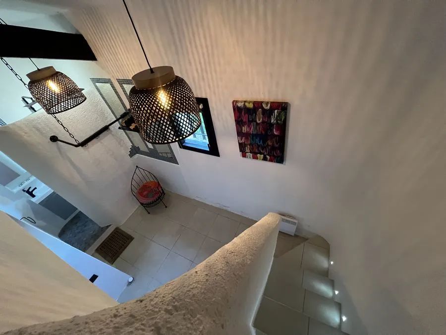Rez de chaussée : entrée, un salon et salle à manger, cuisine équipée, une piscine, une terrasse, un salon de jardin, un barbecue, jardin clos et arboré. Petite pièce office de débarras rangement, une chambre donnant sur la piscine avec une salle de bain et toilette avec un climatiseur. Toilette au rez de chaussée à droite de l'escalier. Une chambre dîtes marocaine avec douche, un lit double 160x190 qui va être ajouté, en duplex un lit double 160x190 avec climatiseur. Une laverie avec machine à lave, grand frigo, un congélateur.