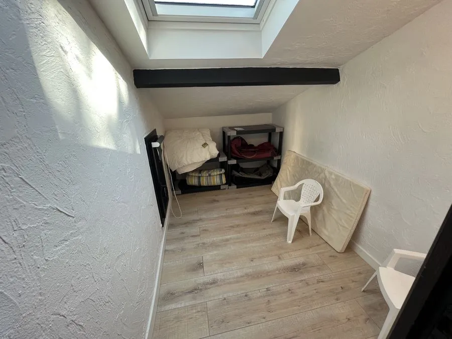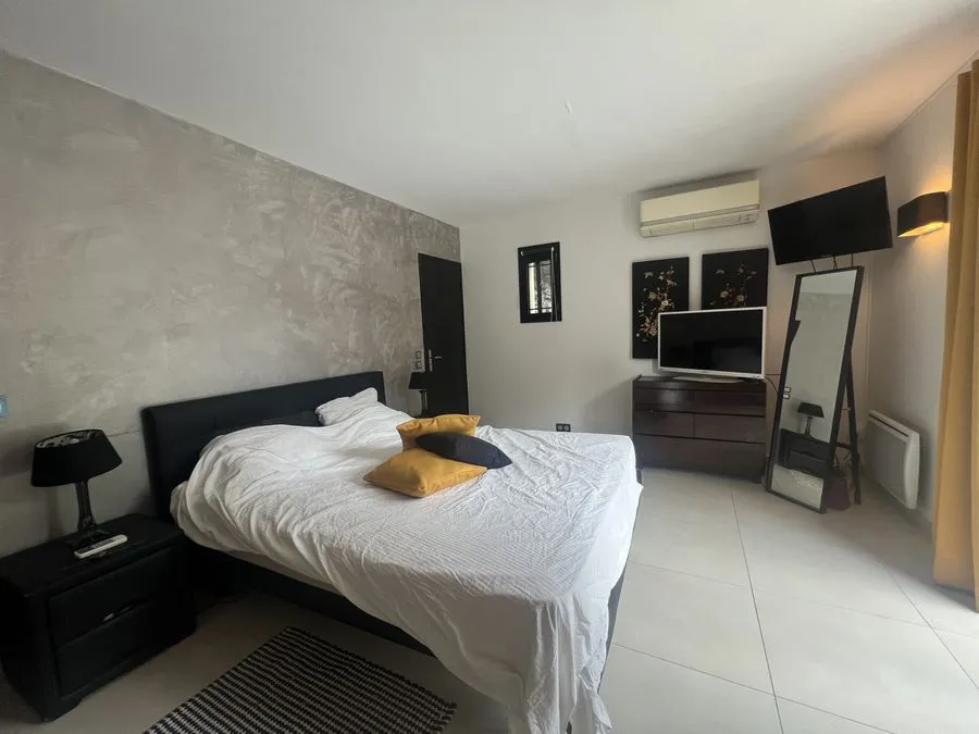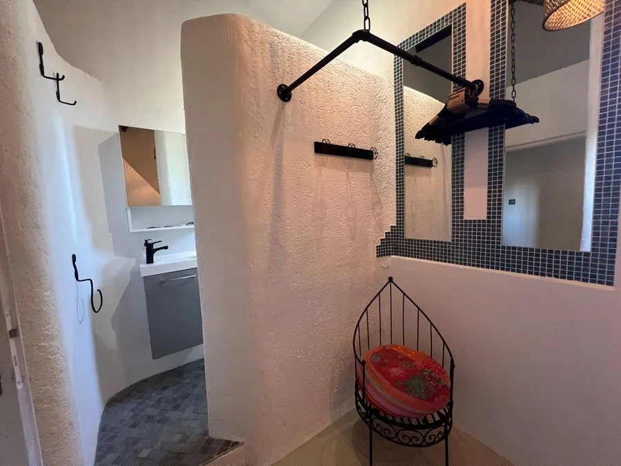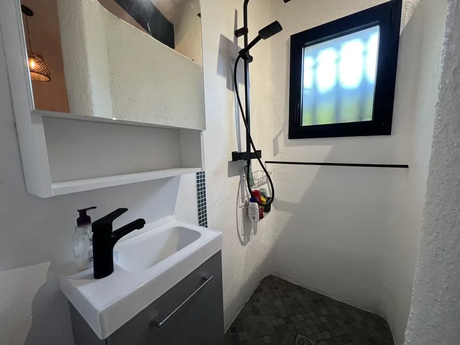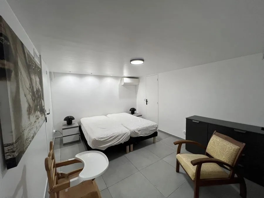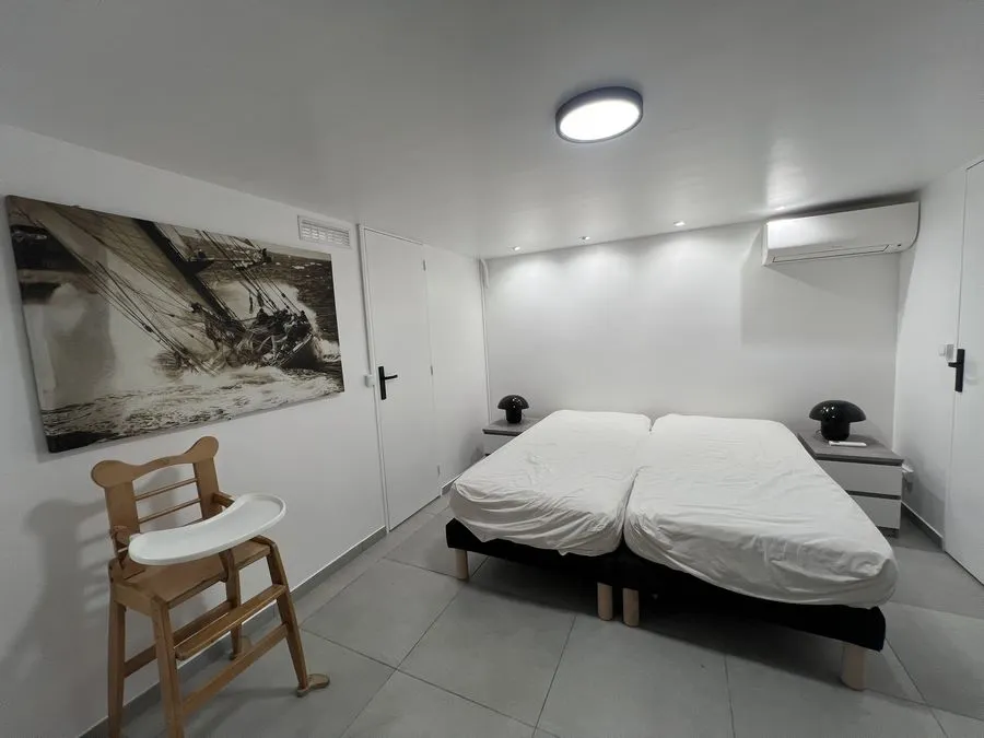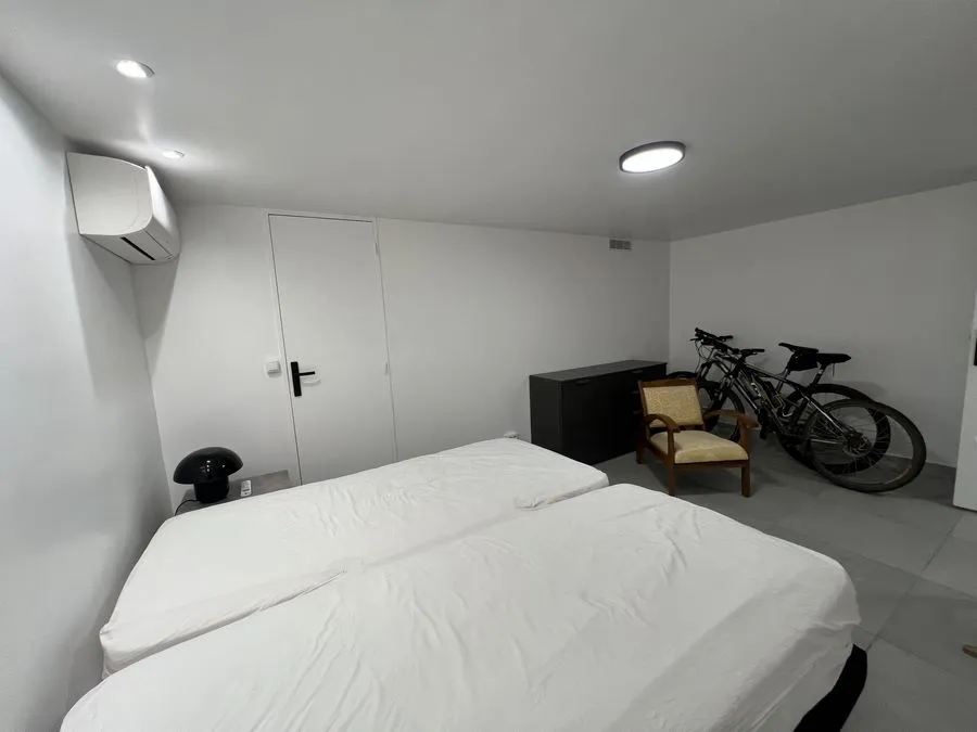 En sous-sol : toilette broyeur, une chambre avec un lit double 160x190, salle de douche entièrement carrelé, climatiseur.