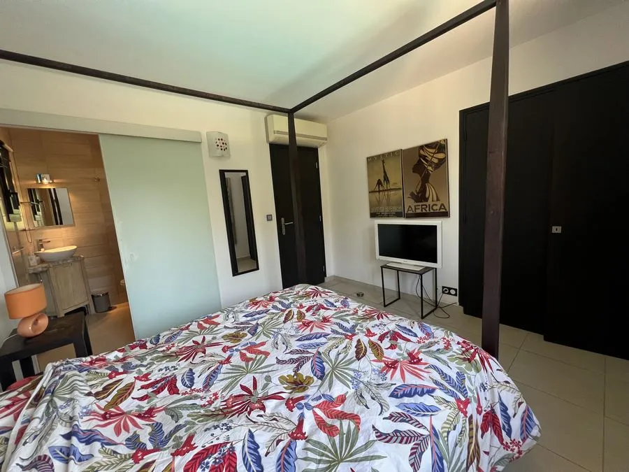 1er étage : une chambre avec lit double 160x190 avec balcon donnant sur la piscine avec toilette en face de la chambre avec lavabo, la douche est située dans le couloir. Une seconde chambre avec un lit double 160x190 en baldaquin, une salle de douche avec toilette, climatiseur également.