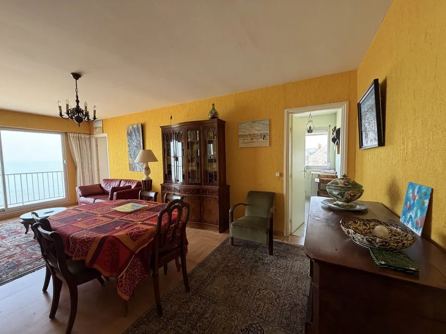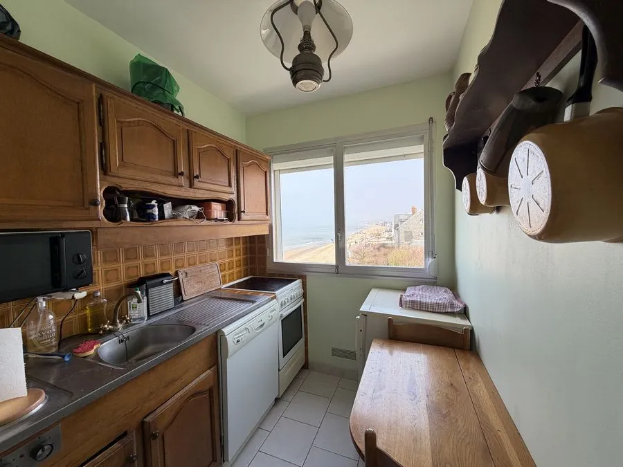 - une salle à manger avec un séjour face mer, une chambre avec salle de douche et toilette, cuisine équipée