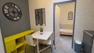 Il se compose d'une entrée et d'une pièce à vivre carrelée. Chaque chambre possède une fenêtre en double vitrage avec volet. Les murs sont en fibre de verre peints en blanc et gris. Vous trouverez une cuisine équipée carrelée avec un évier, 2 plaques électriques, un frigidaire, une hotte et des meubles de cuisine hauts et bas. La salle de bain est carrelée avec une vasque, elle possède une douche et un lavabo. Les toilettes sont indépendantes. L'appartement meublé avec goà»t est composé d'une table et de chaises, 2 chaises de bureau, 2 lits simples, 2 penderies, 2 bureaux, un meuble de rangement jaune, 2 tables de nuit bois et noires.