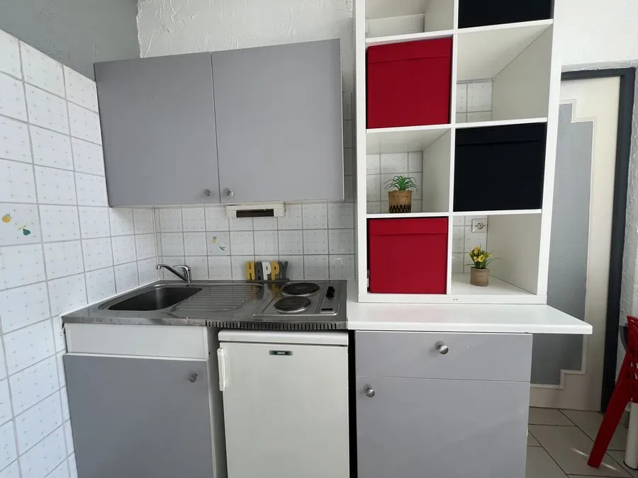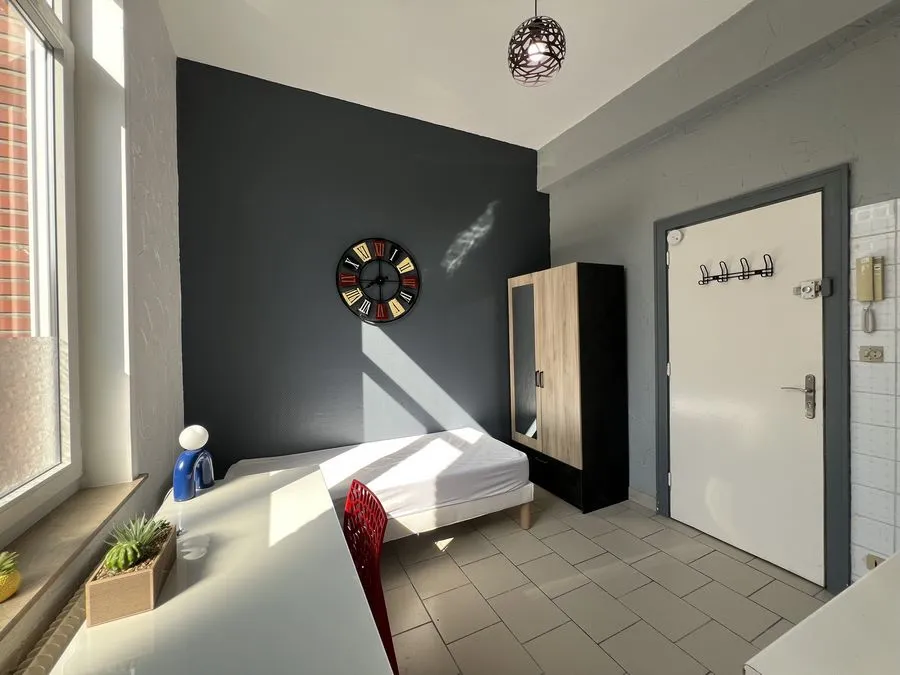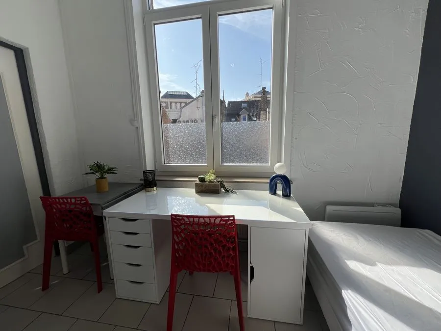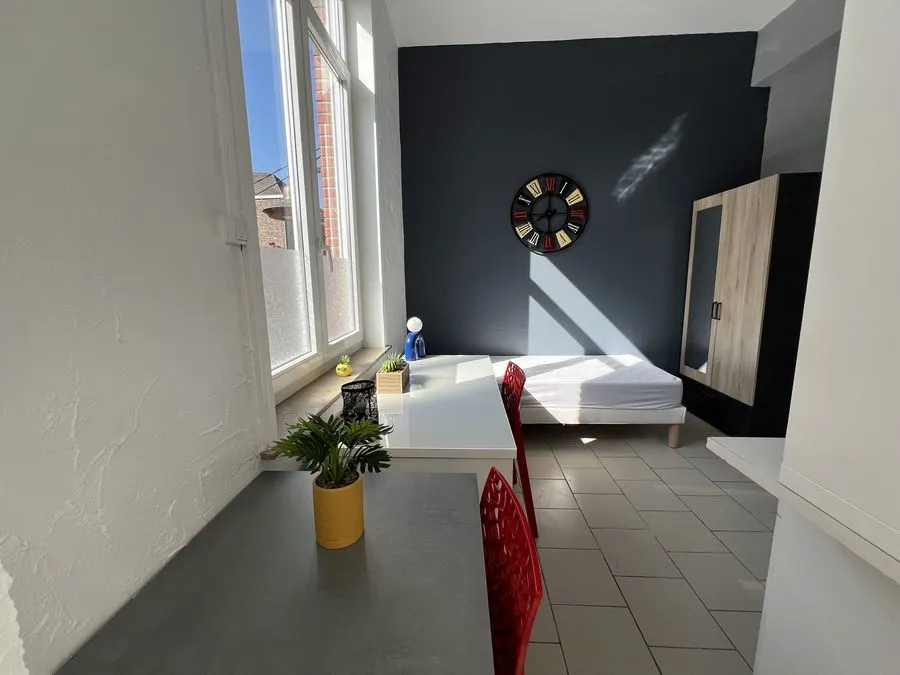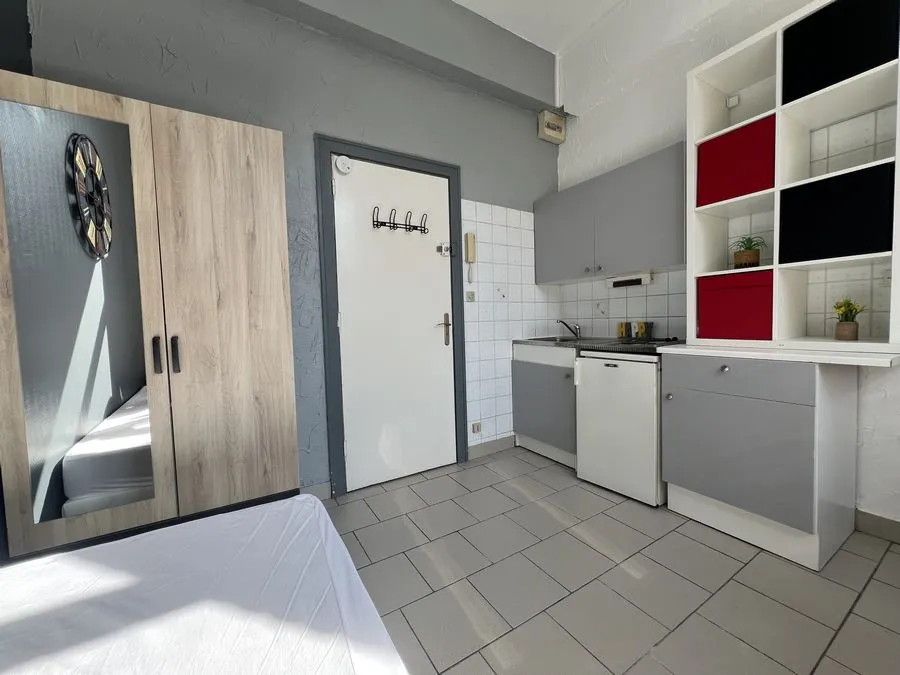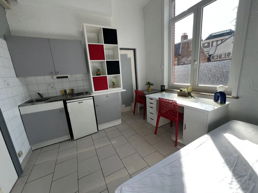 Il se compose d'une pièce à vivre entièrement carrelée. Les murs sont en fibre de verre peints en blanc et gris. Ce studio est muni de 2 fenêtres en PVC double vitrage avec volet. Vous trouverez une kitchenette équipée carrelée avec un évier, 2 plaques électriques, un frigidaire, une hotte et des meubles de cuisine hauts et bas. La salle de douche est carrelée avec une vasque, elle possède une douche, un lavaboet un toilette. L'appartement meublé avec goà»t est composé d'un lit simple, un bureau, une penderie, kitchenette équipée, rideaux, une étagère.