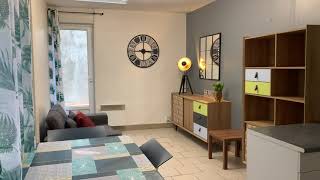 Il se compose d'une pièce à vivre et d'une cour entièrement carrelée. Les murs sont en fibre de verre peints en blanc et gris. Ce type 2 est muni de 3 fenêtres en PVC double vitrage, 2 dans la pièce à vivre et une dans la chambre. Vous trouverez une kitchenette équipée carrelée avec un évier, 2 plaques électriques, un frigidaire, une hotte et des meubles de cuisine hauts et bas. La salle de douche est carrelée avec une vasque, elle possède une douche, un lavabo et un toilette. L'appartement meublé avec goà»t est composé d'un lit double, un bureau, une penderie, kitchenette équipée, rideaux, un canapé gris à 2 places, un buffet, une table basse, un meuble de rangement, une lampe trépieds, 2 tables de nuit jaunes.
