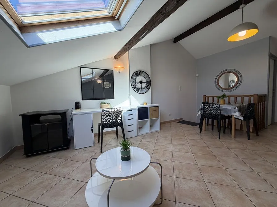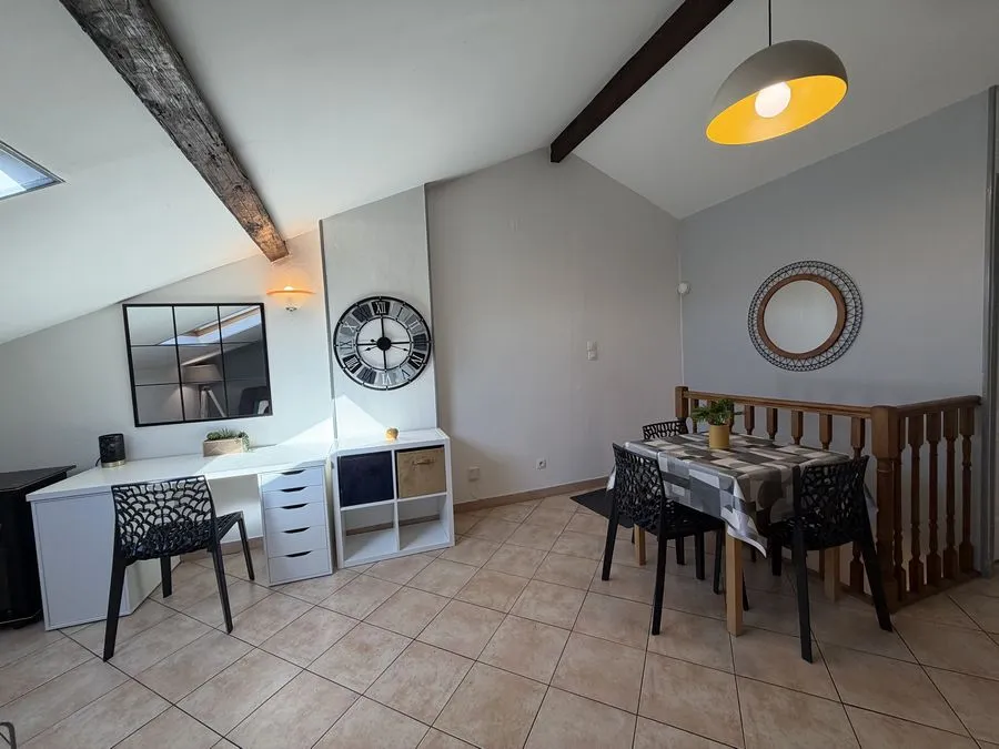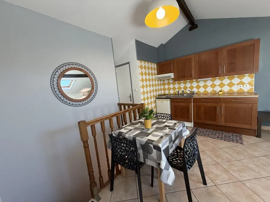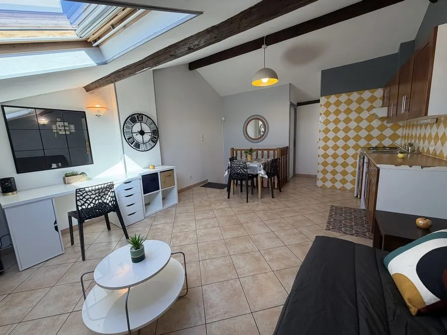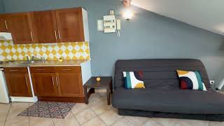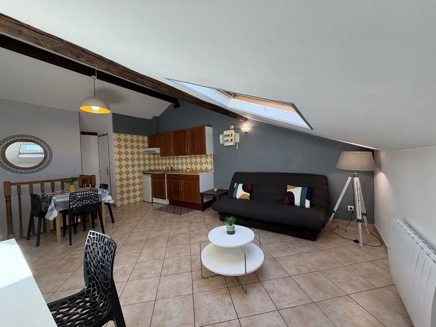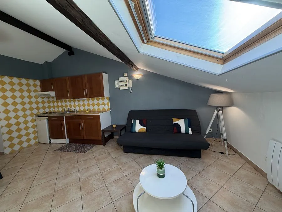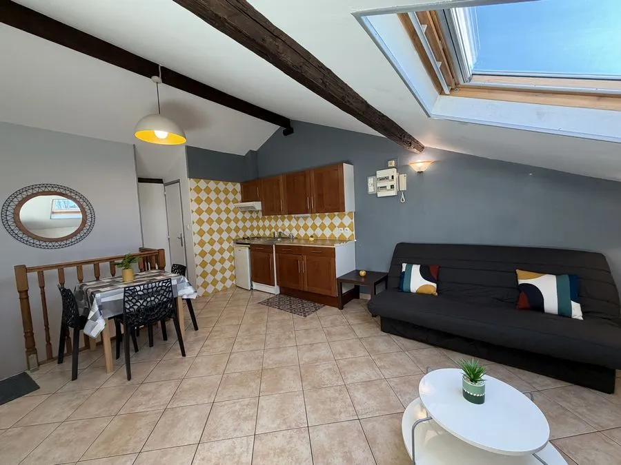 Il se compose d'une pièce à vivre entièrement carrelée. Les murs sont en fibre de verre peints en blanc et gris. Ce type 2 est muni de 2 velux en PVC double vitrage avec volet. Vous trouverez une kitchenette équipée carrelée avec un évier, 2 plaques électriques, un frigidaire, une hotte et des meubles de cuisine hauts et bas. La salle de douche est carrelée avec une vasque, elle possède une douche, un lavabo et un WC. L'appartement meublé avec goà»t est composé d'un lit double, une penderie, kitchenette équipée, un meuble TV, un clic-clac 3 places, un luminaire.