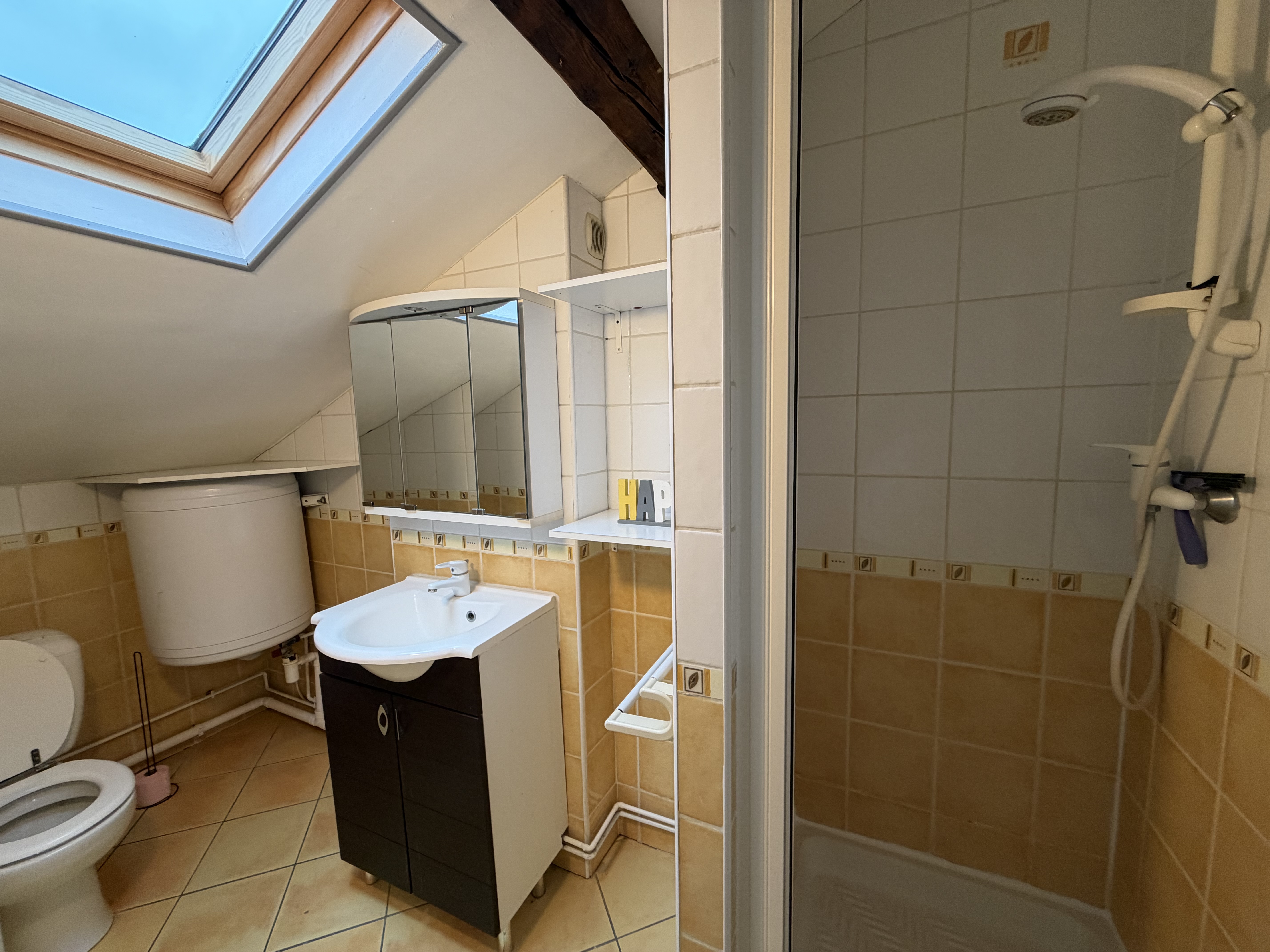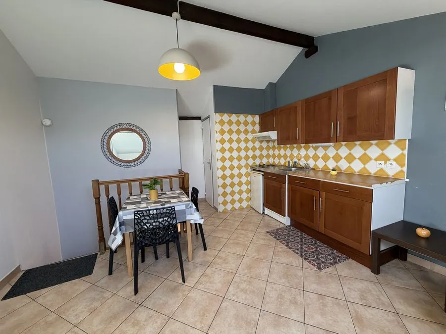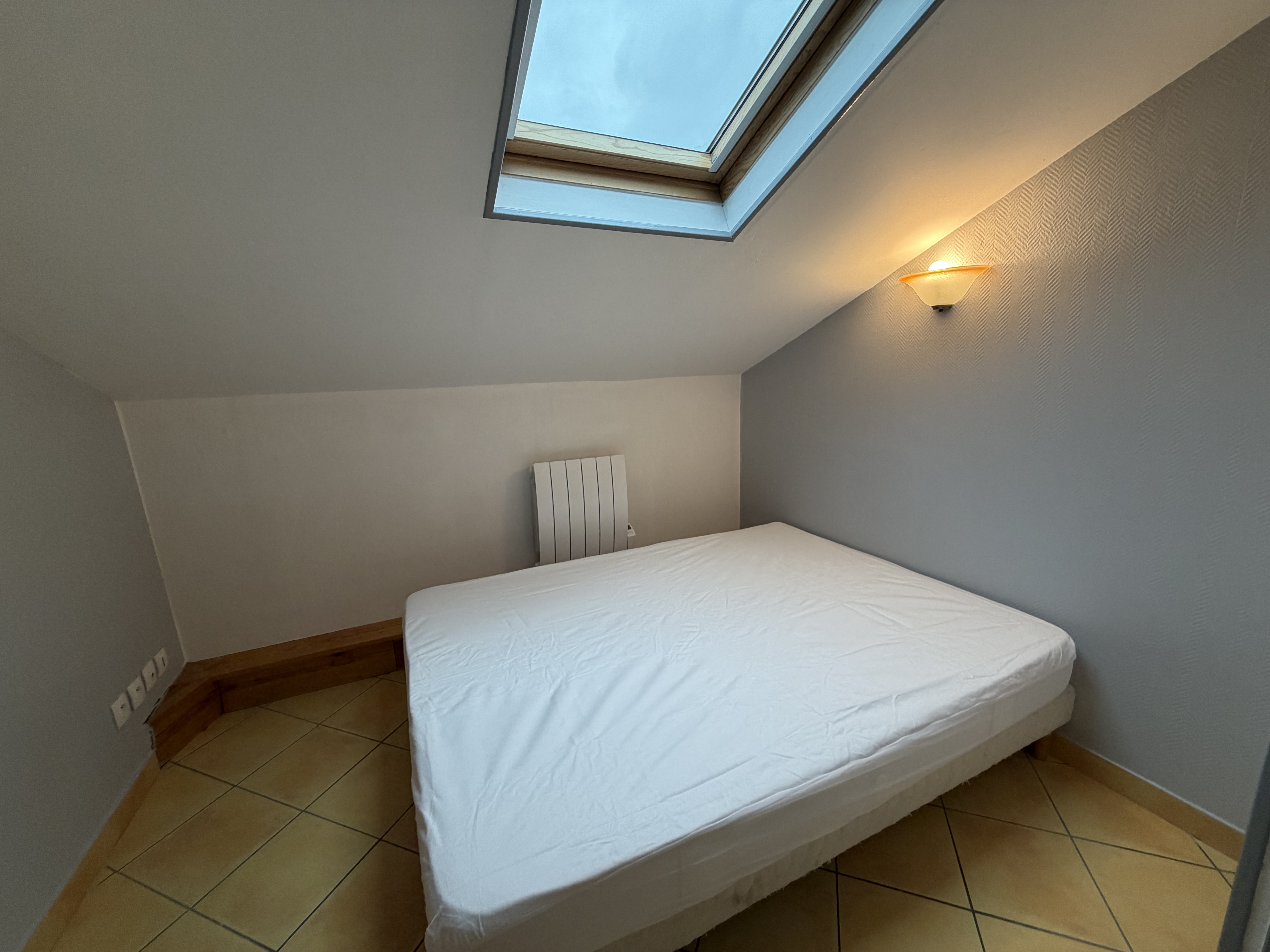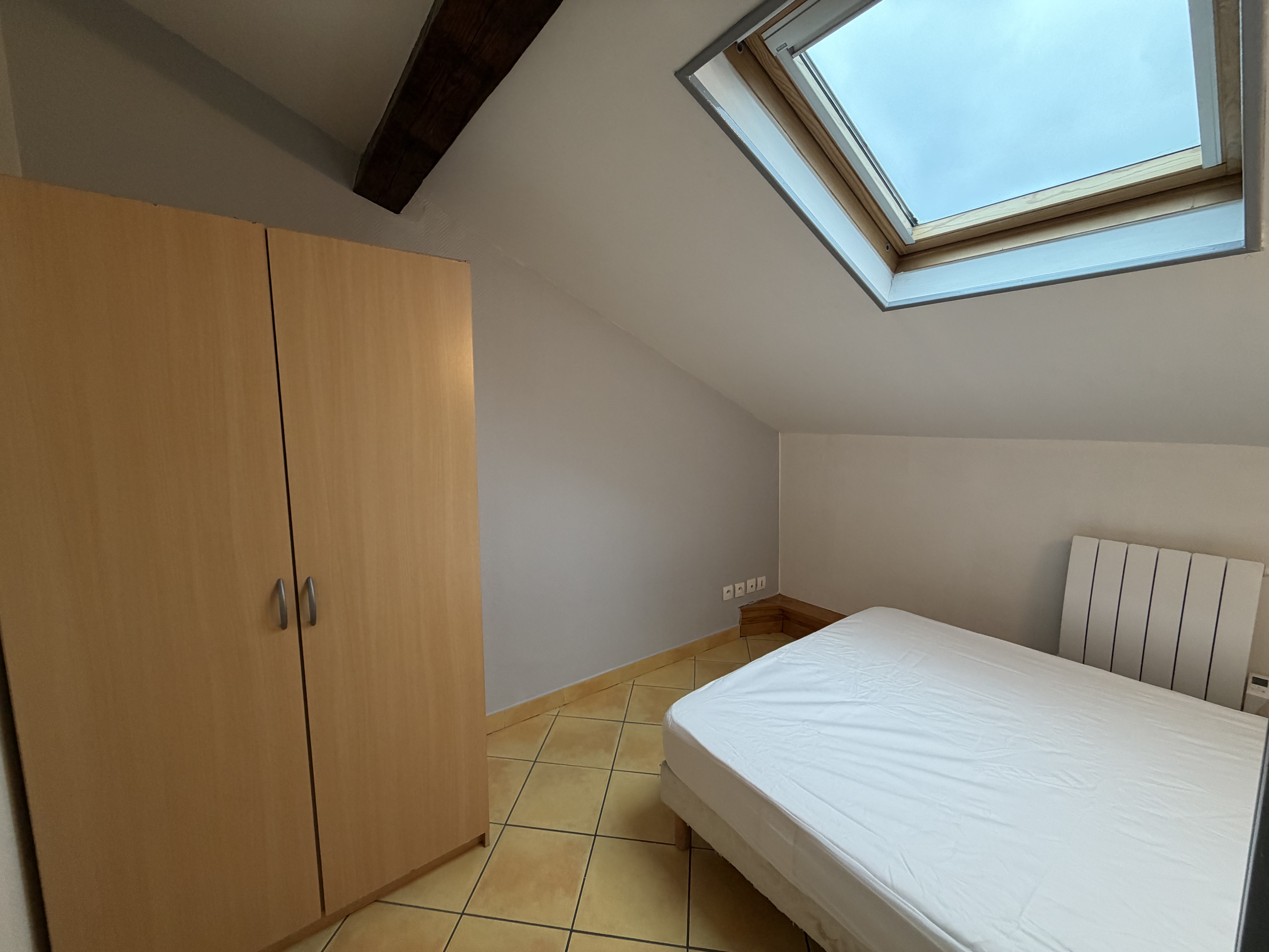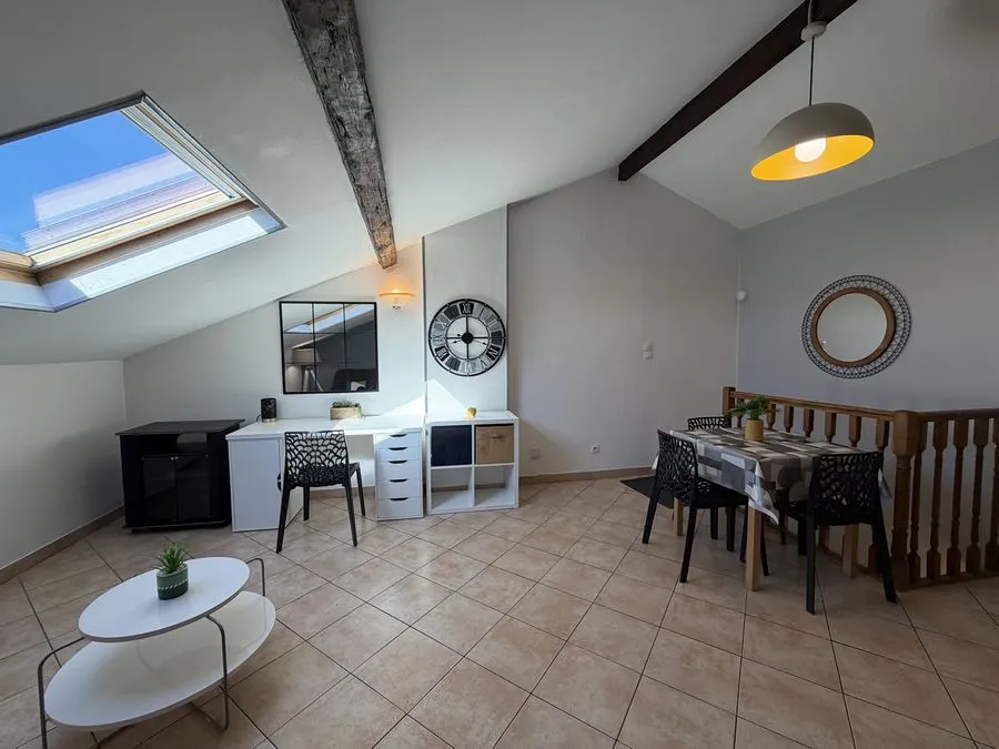 Il se compose d'une pièce à vivre entièrement carrelée. Les murs sont en fibre de verre peints en blanc et gris. Ce type 2 est muni de 2 velux en PVC double vitrage avec volet. Vous trouverez une kitchenette équipée carrelée avec un évier, 2 plaques électriques, un frigidaire, une hotte et des meubles de cuisine hauts et bas. La salle de douche est carrelée avec une vasque, elle possède une douche, un lavabo et un WC. L'appartement meublé avec goà»t est composé d'un lit double, une penderie, kitchenette équipée, un meuble TV, un clic-clac 3 places, un luminaire.